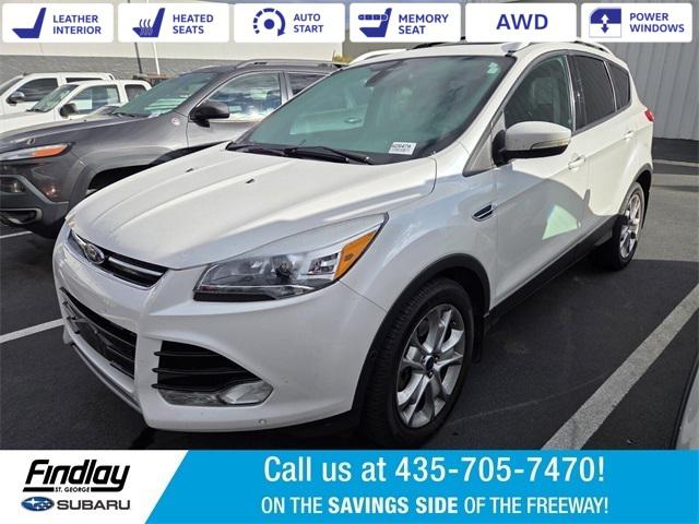 Welcome to Findlay Subaru in St George on the Savings Side of the Freeway. Please contact us at the phone number listed above for any questions that you might have and to check the availability of this vehicle. This Ford Escape is equipped with the following options:AWD, 10 Speakers, 3.51 Axle Ratio, 4-Wheel Disc Brakes, ABS brakes, Air Conditioning, Alloy wheels, AM/FM radio: SiriusXM, Auto-dimming Rear-View mirror, Automatic temperature control, Brake assist, Bumpers: body-color, CD player, Compass, Delay-off headlights, Driver door bin, Driver vanity mirror, Dual front impact airbags, Dual front side impact airbags, Electronic Stability Control, Exterior Parking Camera Rear, Four wheel independent suspension, Front anti-roll bar, Front Bucket Seats, Front Center Armrest, Front dual zone A/C, Front fog lights, Front reading lights, Fully automatic headlights, Garage door transmitter, Heated door mirrors, Heated front seats, Heated Leather-Trimmed Buckets w/60/40 Rear Seat, Illuminated entry, Knee airbag, Leather Shift Knob, Low tire pressure warning, Memory seat, Occupant sensing airbag, Outside temperature display, Overhead airbag, Overhead console, Panic alarm, Passenger door bin, Passenger vanity mirror, Power door mirrors, Power driver seat, Power Liftgate, Power steering, Power windows, Radio data system, Radio: AM/FM Single CD/MP3, Rear anti-roll bar, Rear Parking Sensors, Rear reading lights, Rear seat center armrest, Rear window defroster, Rear window wiper, Remote keyless entry, Roof rack: rails only, Security system, Speed control, Speed-sensing steering, Split folding rear seat, Steering wheel mounted audio controls, SYNC w/MyFord Touch & SYNC Services, Tachometer, Telescoping steering wheel, Tilt steering wheel, Traction control, Trip computer, Turn signal indicator mirrors, Variably intermittent wipers, and Wheels: 18"" Sparkle Nickel Painted Aluminum.