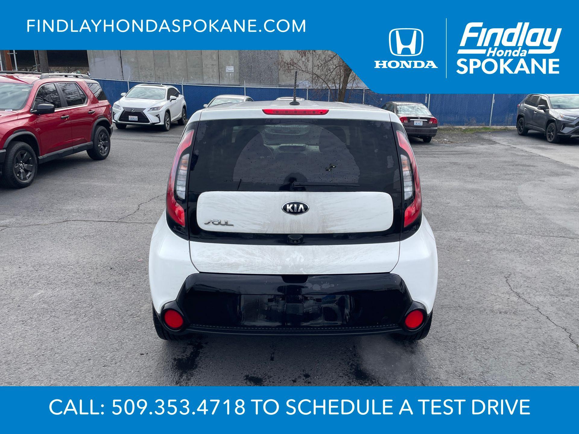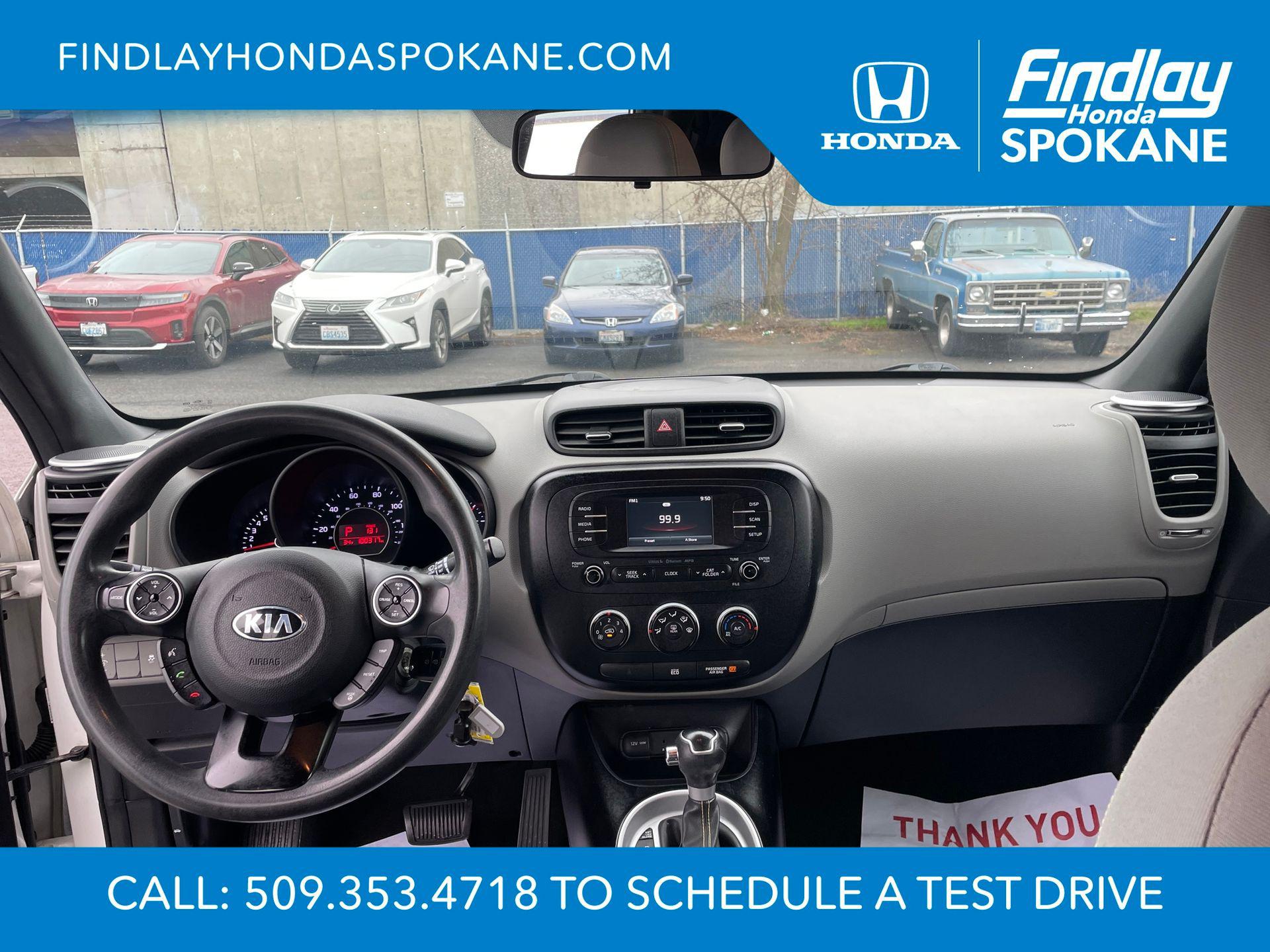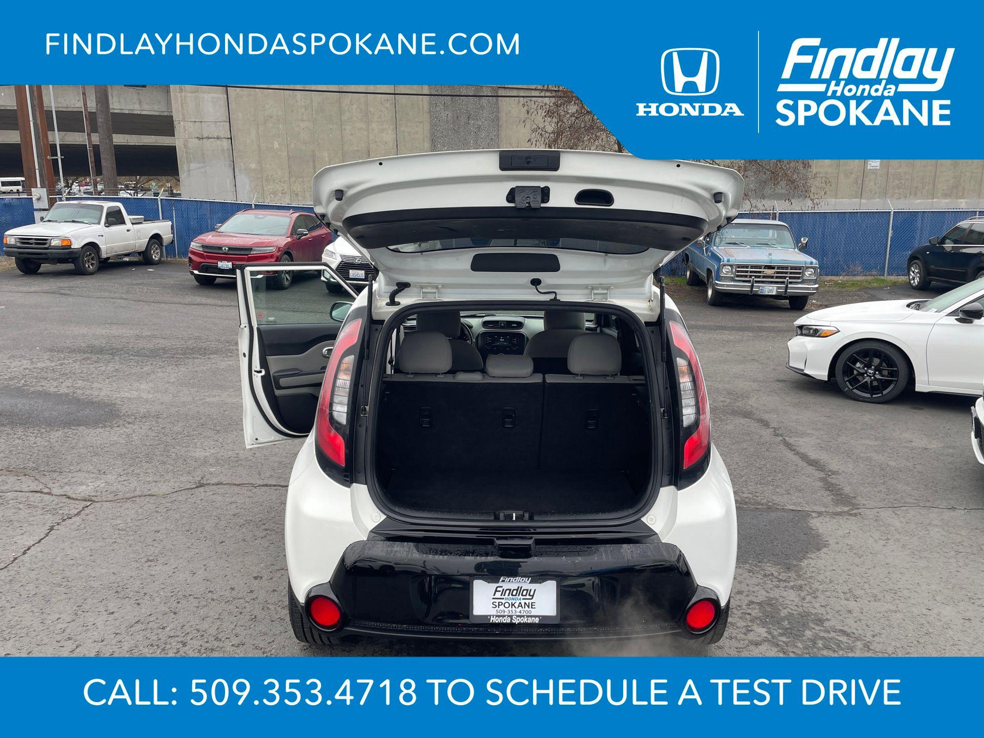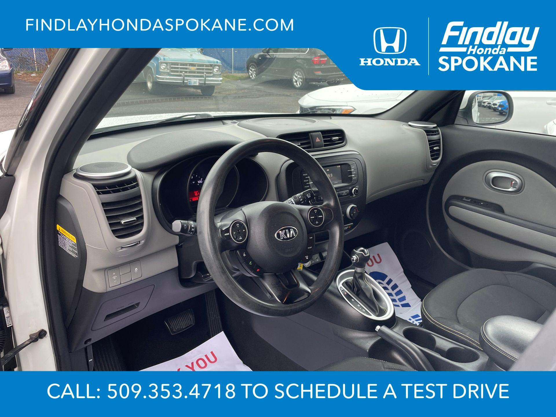Clear White 2016 Kia Soul Plus FWD 6-Speed Automatic I4Friends, family, and neighbors have chosen us time and time again to be their dealer. Our simple and easy process, market aggressive pricing, and friendly knowledgeable staff are all reasons why. Come see for yourself why we are the top rated dealer in Spokane. Our process is designed to be easy, give you choices, and save you time. Our pressure free buying process allows you to see the quote you want. We give every customer multiple different monthly payments and down payments all on one sheet, so you can choose the one that best fits your budget. Come see how easy it is to purchase a car, truck, SUV from Findlay Honda Spokane. This Kia Soul is equipped with these features: 17"" x 6.5J Alloy Wheels, 4-Wheel Disc Brakes, 6 Speakers, 6-Way Adjustable Driver's Seat, ABS brakes, Air Conditioning, Alloy wheels, AM/FM radio: SiriusXM, Brake assist, Bumpers: body-color, Carpeted Floor Mats, Driver door bin, Driver vanity mirror, Dual front impact airbags, Dual front side impact airbags, Electronic Stability Control, Exterior Parking Camera Rear, Front anti-roll bar, Front Bucket Seats, Front Center Armrest, Front fog lights, Front reading lights, Front wheel independent suspension, Fully automatic headlights, Heated door mirrors, Illuminated entry, Low tire pressure warning, Occupant sensing airbag, Outside temperature display, Overhead airbag, Overhead console, Panic alarm, Passenger door bin, Passenger vanity mirror, Power door mirrors, Power steering, Power windows, Radio: AM/FM/MP3 Audio System, Rear seat center armrest, Rear window defroster, Rear window wiper, Remote keyless entry, Speed control, Speed-sensing steering, Split folding rear seat, Steering wheel mounted audio controls, Tachometer, Telescoping steering wheel, Tilt steering wheel, Traction control, Trip computer, Upgraded Cloth Seat Trim, and Variably intermittent wipers.24/31 City/Highway MPGAwards: * JD Power Automotive Performance, Execution and Layout (APEAL) Study, Initial Quality Study (IQS), Vehicle Dependability Study (VDS) * JD Power Automotive Performance, Execution and Layout (APEAL) Study, Initial Quality Study (IQS), Vehicle Dependability Study * 2016 IIHS Top Safety Pick * 2016 KBB.com 10 Best Used Cars Under $15,000 * 2016 KBB.com 10 Coolest New Cars Under $18,000When shopping with Larry H Miller Downtown Dealerships you get the vehicle, you want. We carry one of the largest inventories in Eastern Washington or Idaho because we know you want to have a selection. When shopping for a pre-owned vehicle we have over 5000 vehicles to choose from in stock at one of our 60+ stores, and we are happy to get them here for you. Even if you choose not to purchase with us you will be provide with a written trade appraisal form. This value is guaranteed. This is because we have an unique appraisal process that allows us to have Larry H Miller central appraisal team put a value that represents the best number from our 60+ dealers.
