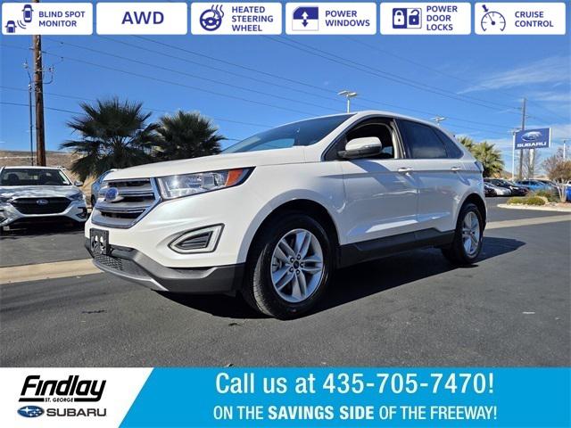 Welcome to Findlay Subaru in St George on the Savings Side of the Freeway. Please contact us at the phone number listed above for any questions that you might have and to check the availability of this vehicle. This Ford Edge is equipped with the following options:Cold Weather Package (Front & Rear Floor Liners, Heated Steering Wheel, and Windshield Wiper De-Icer), Equipment Group 201A (Leather-Trimmed Heated Bucket Seats, Premium 9 Speaker Audio System, and SYNC 3 Communications & Entertainment System), Ford Safe & Smart Package (Adaptive Cruise Control & Fwd Collision Warning, Auto-High Beams, BLIS Blind Spot Information System, Lane-Keeping System, and Rain-Sensing Wipers), AWD, 3.36 Axle Ratio, 4-Wheel Disc Brakes, 6 Speakers, ABS brakes, Air Conditioning, Alloy wheels, AM/FM radio: SiriusXM, AM/FM Stereo w/Single CD Player, Auto-dimming Rear-View mirror, Automatic temperature control, Brake assist, Bumpers: body-color, CD player, Compass, Delay-off headlights, Driver door bin, Driver vanity mirror, Dual front impact airbags, Dual front side impact airbags, Electronic Stability Control, Emergency communication system: 911 Assist, Exterior Parking Camera Rear, Four wheel independent suspension, Front anti-roll bar, Front Bucket Seats, Front Center Armrest w/Storage, Front dual zone A/C, Front reading lights, Fully automatic headlights, Heated door mirrors, Illuminated entry, Knee airbag, Leather Shift Knob, Low tire pressure warning, Occupant sensing airbag, Outside temperature display, Overhead airbag, Overhead console, Panic alarm, Passenger door bin, Passenger vanity mirror, Power door mirrors, Power driver seat, Power passenger seat, Power steering, Power windows, Rear anti-roll bar, Rear Parking Sensors, Rear reading lights, Rear seat center armrest, Rear window defroster, Rear window wiper, Remote keyless entry, SiriusXM Radio, Speed control, Speed-Sensitive Wipers, Split folding rear seat, Spoiler, Steering wheel mounted audio controls, SYNC Communications & Entertainment System, Tachometer, Telescoping steering wheel, Tilt steering wheel, Traction control, Trip computer, Turn signal indicator mirrors, Unique Cloth Bucket Seats, Variably intermittent wipers, and Wheels: 18"" Sparkle Silver Painted Aluminum.