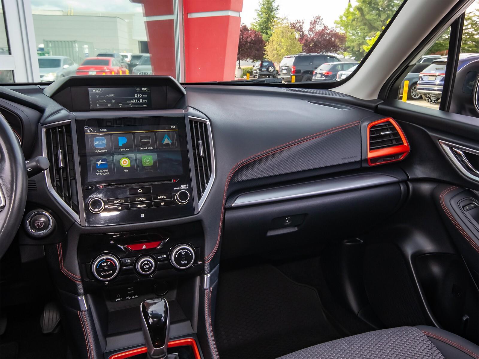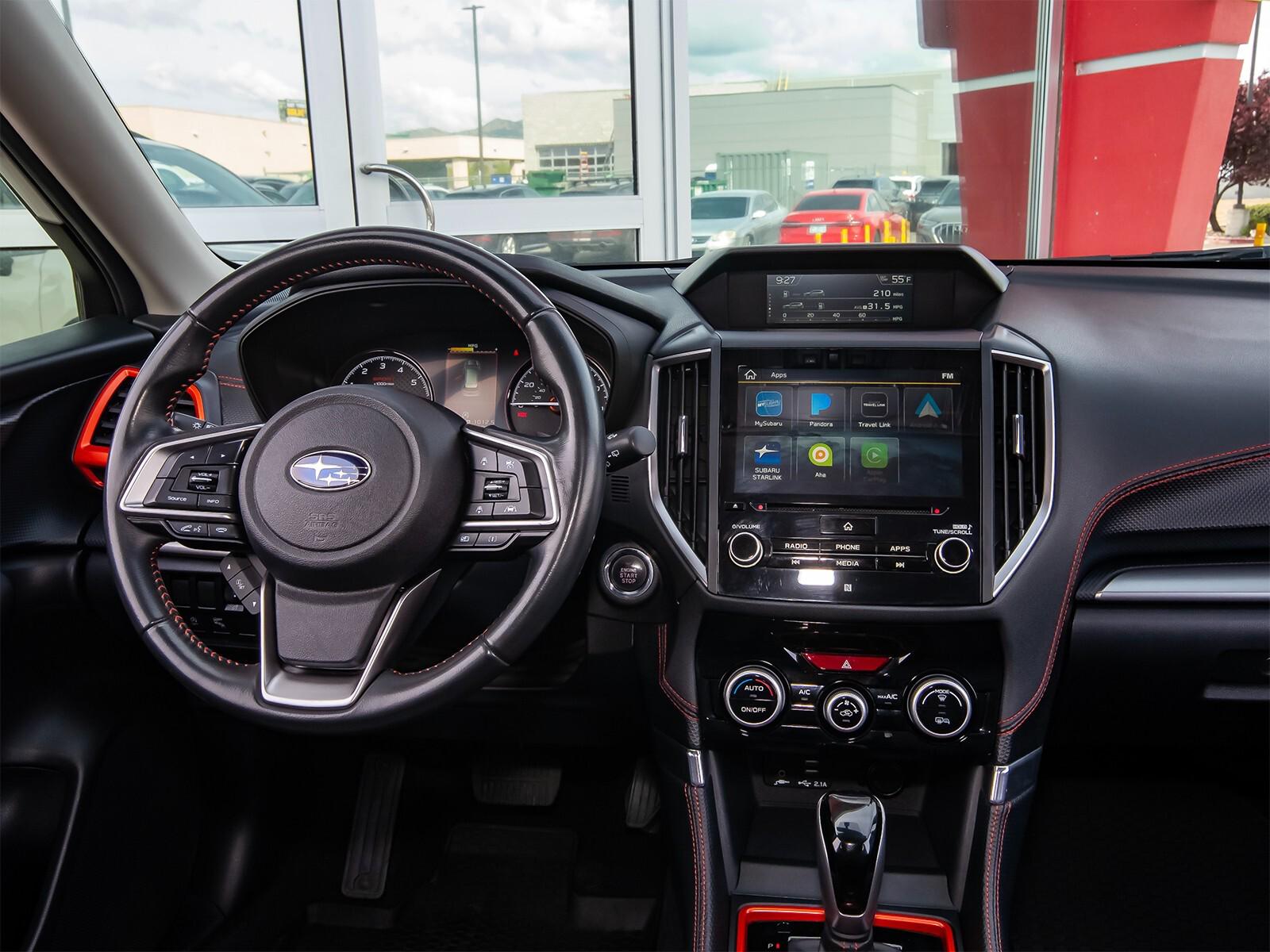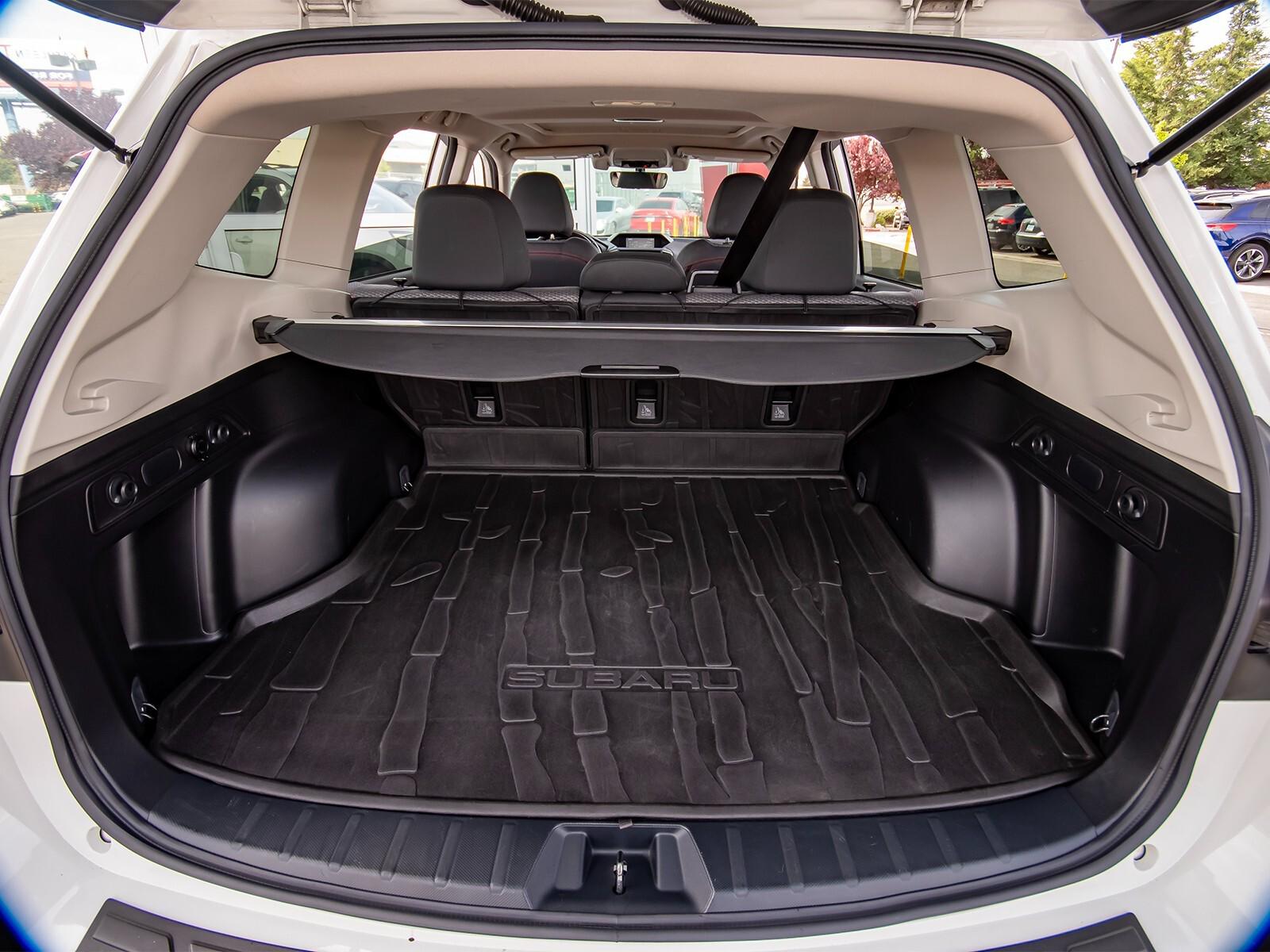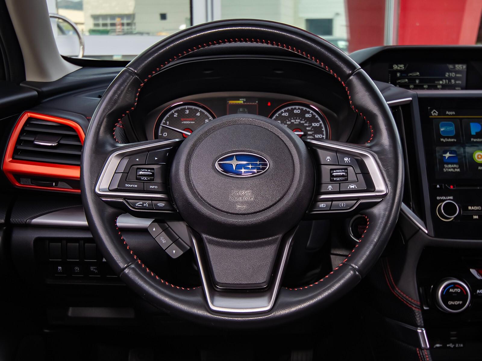 3.70 Axle Ratio, 4-Wheel Disc Brakes, 6 Speakers, ABS brakes, Aero Crossbar Set, Air Conditioning, All-Weather Floor Liners, Alloy wheels, AM/FM radio: SiriusXM, Auto High-beam Headlights, Auto-Dimming Exterior Mirror w/Approach Lighting, Auto-Dimming Mirror w/Compass & HomeLink, Automatic temperature control, Blind Spot Detection w/Rear Cross Traffic Alert, Brake assist, BSD & Reverse Auto Braking & Multimedia Plus Audio, Bumpers: body-color, Cargo Net, CD player, Driver door bin, Driver vanity mirror, Dual front impact airbags, Dual front side impact airbags, Electronic Stability Control, Emergency communication system: STARLINK Safety and Security, Exterior Parking Camera Rear, Four wheel independent suspension, Front anti-roll bar, Front Bucket Seats, Front Center Armrest, Front fog lights, Front reading lights, Fully automatic headlights, Heated door mirrors, Heated Front Bucket Seats, Heated front seats, Illuminated entry, Knee airbag, Leather Shift Knob, Low tire pressure warning, Occupant sensing airbag, Outside temperature display, Overhead airbag, Overhead console, Paddle-Shift Control Switches, Panic alarm, Passenger door bin, Passenger vanity mirror, Popular Package #2, Power door mirrors, Power driver seat, Power moonroof: Panoramic, Power steering, Power windows, Radio data system, Radio: Subaru Starlink 6.5'' Multimedia Plus System, Radio: Subaru Starlink 8.0'' Multimedia Plus System, Rear anti-roll bar, Rear Bumper Cover, Rear seat center armrest, Rear Seatback Protector, Rear window defroster, Rear window wiper, Remote keyless entry, Reverse Automatic Braking System (RAB), Roof rack: rails only, Security system, Speed control, Speed-sensing steering, Splash Guards, Split folding rear seat, Spoiler, Sport Cloth Upholstery, STARLINK/Apple CarPlay/Android Auto, Steering wheel mounted audio controls, Tachometer, Telescoping steering wheel, Tilt steering wheel, Traction control, Trip computer, Turn signal indicator mirrors, Variably intermittent wipers,