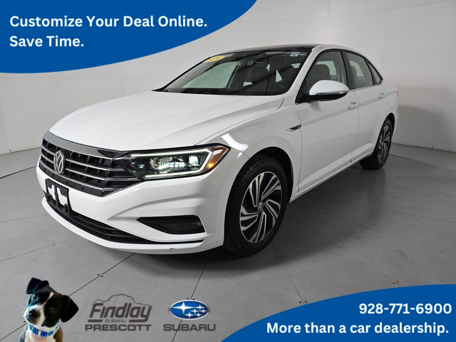 Jetta SEL, 4D Sedan, 1.4L TSI, 8-Speed Automatic with Tiptronic, FWD, Titan Black Leather.Visit with our NON-Commission team, for a hassle free experience! Save more with Findlay Subaru Prescott, with our competitive, market based pricing! This Volkswagen Jetta is equipped with the following features: Jetta SEL, 4D Sedan, 1.4L TSI, 8-Speed Automatic with Tiptronic, FWD, Titan Black Leather, 4-Wheel Disc Brakes, 9 Speakers, ABS brakes, Active Blind Spot Monitor, Air Conditioning, Alloy wheels, AM/FM radio: SiriusXM, Auto High-beam Headlights, Auto-dimming Rear-View mirror, Automatic temperature control, Brake assist, Bumpers: body-color, Delay-off headlights, Driver door bin, Driver vanity mirror, Dual front impact airbags, Dual front side impact airbags, Electronic Stability Control, Emergency communication system: VW Car-Net services (capabilities require enrollment or subscription), Exterior Parking Camera Rear, Front anti-roll bar, Front Bucket Seats, Front Center Armrest, Front dual zone A/C, Front fog lights, Front reading lights, Front wheel independent suspension, Fully automatic headlights, Heated door mirrors, Heated front seats, Heated rear seats, Heated steering wheel, Htd & Actively Ventilated Fr Comfort Sport Seats, Illuminated entry, Leather Shift Knob, Low tire pressure warning, Memory seat, Navigation System, Occupant sensing airbag, Outside temperature display, Overhead airbag, Overhead console, Panic alarm, Passenger door bin, Passenger vanity mirror, Perforated Leather Seat Trim, Power door mirrors, Power driver seat, Power moonroof, Power steering, Power windows, Radio data system, Radio: Discover Media w/8 Touchscreen Navigation, Rain sensing wipers, Rear anti-roll bar, Rear reading lights, Rear seat center armrest, Rear window defroster, Remote CD player, Remote keyless entry, Security system, Speed control, Speed-sensing steering, Split folding rear seat, Steering wheel mounted audio controls, Tachometer, Telescoping steering wheel, Tilt steering wheel, Traction control, Trip computer, Turn signal indicator mirrors, Variably intermittent wipers, Ventilated front seats, VW App-Connect (w/Apple CarPlay, Android Auto & MirrorLink), and Wheels: 17 2-Tone Machined Alloy.CARFAX One-Owner. Clean CARFAX.We use Market Based Pricing to give you the best price, upfront, without games. We do the shopping, so you get the deals!2020 Volkswagen Jetta SEL Premium 30/40 City/Highway MPG Odometer is 49585 miles below market average!Awards:* 2020 KBB.com 10 Coolest New Cars Under $20,000