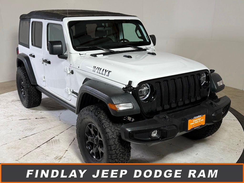 2021 Jeep Wrangler Unlimited Willys Certified Pre-Owned CARFAX One-Owner Clean CARFAXBright White Clearcoat | 4WD | 4D Sport Utility | 8-Speed Automatic | 2.0L I4CPO Benefits: 7-Year / 100,000-Mile Powertrain Warranty, 24/7 Roadside Assistance, Multi-Point Inspection, Carfax Vehicle History, Transferable WarrantyHighlights:Quick Order Package 22W Willys, Cold Weather Group, Convenience Group, LED Headlamp & Fog Lamp Group, Trailer Tow & HD Electrical GroupTop Features:Heated Front Seats & Steering Wheel, Leather Wrapped Steering Wheel, Power Heated Mirrors, ParkView Rear Camera, Uconnect 3 w/5"" Display, 17"" Moab Black Aluminum Wheels, MOPAR All-Weather Floor Mats, Auxiliary Switches & Class II Receiver Hitch, Anti-Spin Rear Differential, Integrated Roll-Over Protection** ONLINE PRICE DOES NOT REFLECT $599 CERTIFICATION FEE **