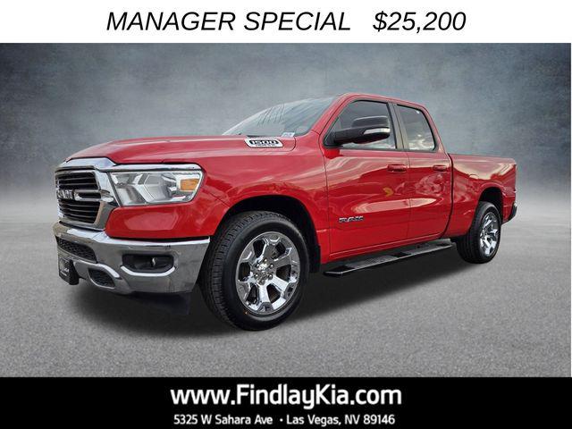 Welcome to Findlay Kia on Sahara Ave in Las Vegas. All of our vehicles are hand picked and inspected for your piece of mind. This Ram 1500 is equipped with the following options: Big Horn Level 1 Equipment Group (Auto-Dimming Exterior Driver Mirror, Auto-Dimming Rear-View Mirror, Black Premium Power Mirrors, Cluster 3.5"" TFT Color Display, Foam Bottle Insert (Door Trim Panel), Power 4-Way Driver Lumbar Adjust, Power 8-Way Driver Seat, Power Adjustable Pedals, Radio: Uconnect 4 w/8.4"" Display, Rear Power Sliding Window, SiriusXM Radio Service, and Sun Visors w/Illuminated Vanity Mirrors), Quick Order Package 25Z Big Horn (DISC), 3 Rear Seat Head Restraints, 3.21 Rear Axle Ratio, 4 Way Front Headrests, 4-Wheel Disc Brakes, 40/20/40 Split Bench Seat, 48V Belt Starter Generator, 6 Speakers, ABS brakes, Air Conditioning, Alloy wheels, AM/FM radio, Anti-Spin Differential Rear Axle, Black Exterior Mirrors, Brake assist, Bumpers: chrome, Cloth Bench Seat, Compass, Delay-off headlights, Driver door bin, Dual front impact airbags, Dual front side impact airbags, Electronic Stability Control, Front anti-roll bar, Front Center Armrest w/Storage, Front fog lights, Front License Plate Bracket, Front reading lights, Front Seat Back Map Pockets, Front wheel independent suspension, Fully automatic headlights, GPS Antenna Input, Heated door mirrors, Illuminated entry, Integrated Voice Command w/Bluetooth, Leather steering wheel, Low tire pressure warning, Manual Adjust 4-Way Front Passenger Seat, Manufacturer's Statement of Origin, MOPAR Front & Rear Rubber Floor Mats, Occupant sensing airbag, Outside temperature display, Overhead airbag, Overhead console, Panic alarm, ParkView Rear Back-Up Camera, Passenger door bin, Passenger vanity mirror, Power door mirrors, Power steering, Power windows, Radio data system, Radio: Uconnect 3 w/5"" Display, Rear 60/40 Folding Seat, Rear anti-roll bar, Rear seat center armrest, Rear step bumper, Remote keyless entry, Speed control, Split folding rear seat, Steering wheel mounted audio controls, Tachometer, Telescoping steering wheel, Tilt steering wheel, Traction control, Trailer Brake Control, Trip computer, Variably intermittent wipers, Voltmeter, Wheels: 18"" x 8"" Cast-Aluminum Painted, and Wheels: 20"" x 9"" Aluminum Chrome Clad (WRK)Flame Red Clearcoat 2021 Ram 1500 Big Horn/Lone Star RWD 8-Speed Automatic HEMI 5.7L V8 Multi Displacement VVTOdometer is 3389 miles below market average!