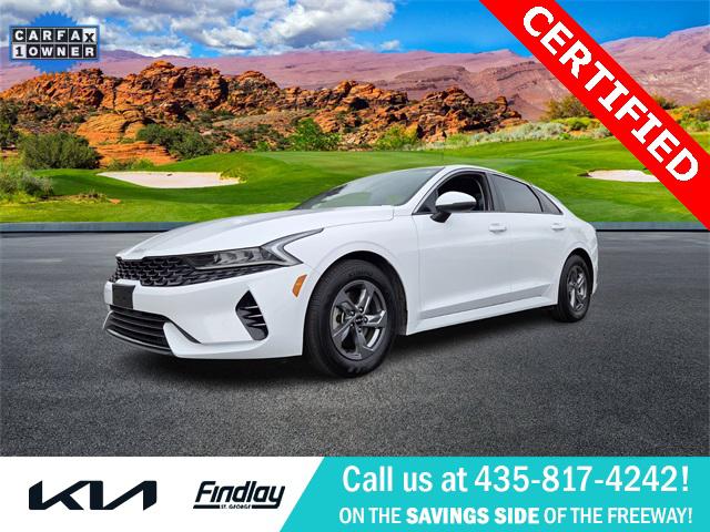 Welcome To Findlay Kia in St. George. All of our vehicles are hand picked and inspected for your peace of mind. Come see us (On the SAVINGS SIDE of the FREEWAY). This Kia K5 is equipped with the following options: 4-Wheel Disc Brakes, 6 Speakers, ABS brakes, Air Conditioning, Alloy wheels, AM/FM radio, Auto High-beam Headlights, Automatic temperature control, Brake assist, Bumpers: body-color, Cargo Net, Carpeted Floor Mats, Cloth Seat Trim, Delay-off headlights, Driver door bin, Driver vanity mirror, Dual front impact airbags, Dual front side impact airbags, Electronic Stability Control, Four wheel independent suspension, Front anti-roll bar, Front Bucket Seats, Front Center Armrest, Front dual zone A/C, Front reading lights, Fully automatic headlights, Heated door mirrors, Illuminated entry, Knee airbag, Low tire pressure warning, Occupant sensing airbag, Outside temperature display, Overhead airbag, Overhead console, Panic alarm, Passenger door bin, Passenger vanity mirror, Power door mirrors, Power steering, Power windows, Radio data system, Radio: AM/FM/MP3 Audio System, Rear anti-roll bar, Rear seat center armrest, Rear side impact airbag, Rear window defroster, Remote keyless entry, Security system, Speed control, Speed-sensing steering, Split folding rear seat, Steering wheel mounted audio controls, Tachometer, Telescoping steering wheel, Tilt steering wheel, Traction control, Trip computer, Variably intermittent wipers, and Wheels: 16"" Gray Alloy.CARFAX One-Owner. Certified.Kia Certified Pre-Owned Details: * 165 Point Inspection * Warranty Deductible: $50 * Limited Warranty: 12 Month/12,000 Mile (whichever comes first) ""Platinum Coverage"" from certified purchase date * Powertrain Limited Warranty: 120 Month/100,000 Mile (whichever comes first) from original in-service date * Transferable Warranty * Includes Rental Car and Trip Interruption Reimbursement. 3 month Sirius trial subscription * Vehicle History * Roadside Assistance4D Sedan FWD 8-Speed Automatic 1.6L I4 DGI Turbocharged DOHC 16V LEV3-ULEV70 180hpOdometer is 15649 miles below market average! 27/37 City/Highway MPGThank you again for your consideration. We have this Kia K5 and dozens more available at www.findlaykiastgeorge.com or call us at 435-817-4242.