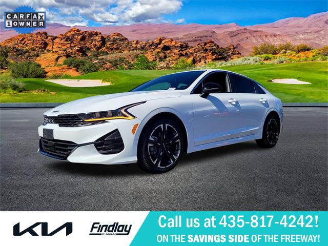 Welcome To Findlay Kia in St. George. All of our vehicles are hand picked and inspected for your peace of mind. Come see us (On the SAVINGS SIDE of the FREEWAY). This Kia K5 is equipped with the following options: GT-Line Premium Package (Forward Collision Avoidance-Assist, Highway Driving Assist, LED Projection Headlamps, and Smart Cruise Control w/Stop & Go), 4-Wheel Disc Brakes, 6 Speakers, ABS brakes, Air Conditioning, Alloy wheels, AM/FM radio: SiriusXM, Apple CarPlay & Android Auto, Auto High-beam Headlights, Automatic temperature control, Brake assist, Bumpers: body-color, Carpeted Floor Mats, Cloth/SynTex Seat Trim, Delay-off headlights, Driver door bin, Driver vanity mirror, Dual front impact airbags, Dual front side impact airbags, Electronic Stability Control, Four wheel independent suspension, Front anti-roll bar, Front Bucket Seats, Front Center Armrest, Front dual zone A/C, Front fog lights, Front reading lights, Fully automatic headlights, Heated door mirrors, Illuminated entry, Knee airbag, Low tire pressure warning, Navigation System, Occupant sensing airbag, Outside temperature display, Overhead airbag, Overhead console, Panic alarm, Passenger door bin, Passenger vanity mirror, Power door mirrors, Power driver seat, Power steering, Power windows, Radio data system, Radio: AM/FM/MP3 Audio System, Rear anti-roll bar, Rear seat center armrest, Rear side impact airbag, Rear window defroster, Remote keyless entry, Security system, Speed control, Speed-sensing steering, Split folding rear seat, Spoiler, Sport steering wheel, Steering wheel mounted audio controls, Tachometer, Telescoping steering wheel, Tilt steering wheel, Traction control, Trip computer, Turn signal indicator mirrors, Variably intermittent wipers, and Wheels: 18"" Gloss Black Machined Finish Alloy.CARFAX One-Owner. Certified.Kia Certified Pre-Owned Details: * Warranty Deductible: $50 * Transferable Warranty * Powertrain Limited Warranty: 120 Month/100,000 Mile (whichever comes first) from original in-service date * 165 Point Inspection * Includes Rental Car and Trip Interruption Reimbursement. 3 month Sirius trial subscription * Limited Warranty: 12 Month/12,000 Mile (whichever comes first) ""Platinum Coverage"" from certified purchase date * Roadside Assistance * Vehicle History4D Sedan FWD 8-Speed Automatic 1.6L I4 DGI Turbocharged DOHC 16V LEV3-ULEV70 180hpOdometer is 25736 miles below market average! 27/37 City/Highway MPGThank you again for your consideration. We have this Kia K5 and dozens more available at www.findlaykiastgeorge.com or call us at 435-817-4242.
