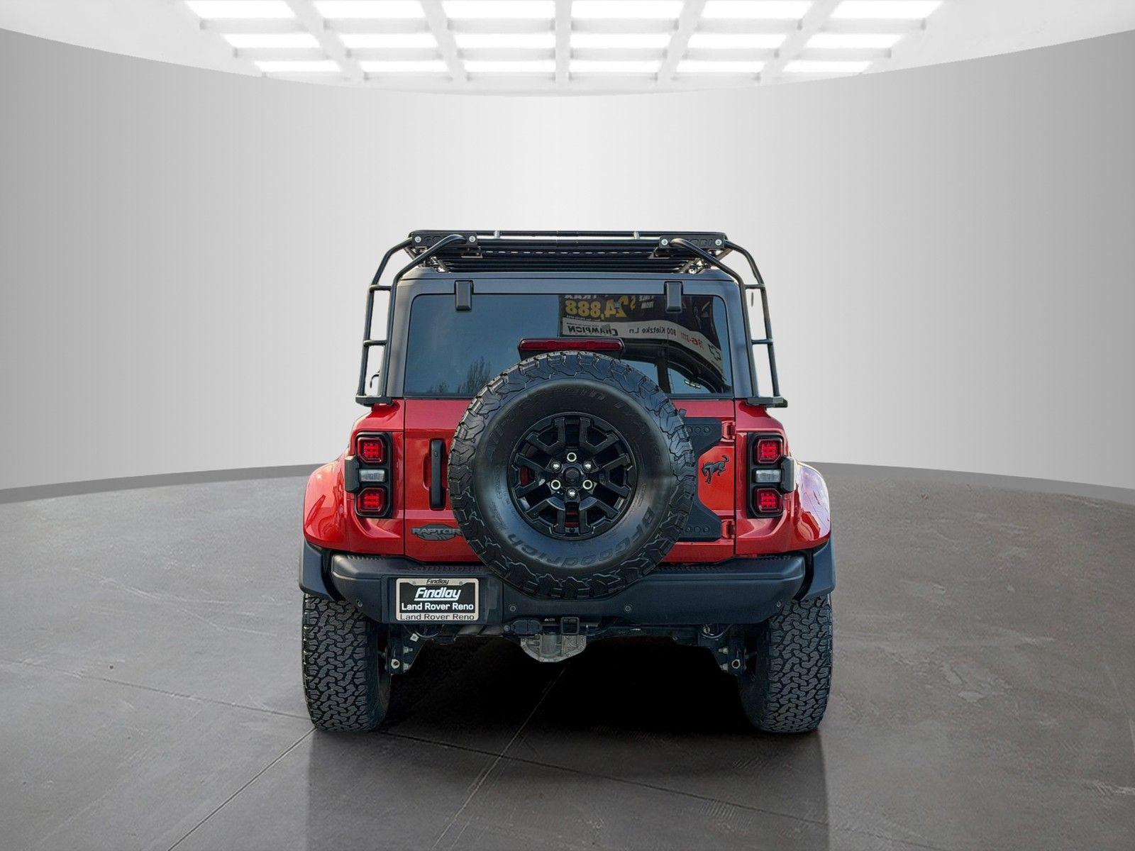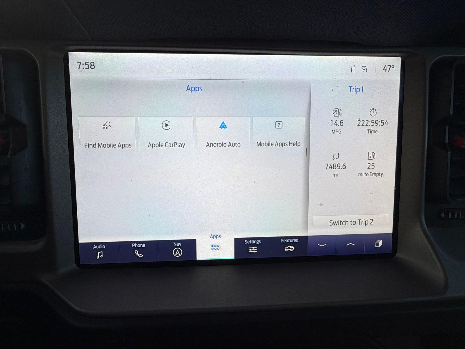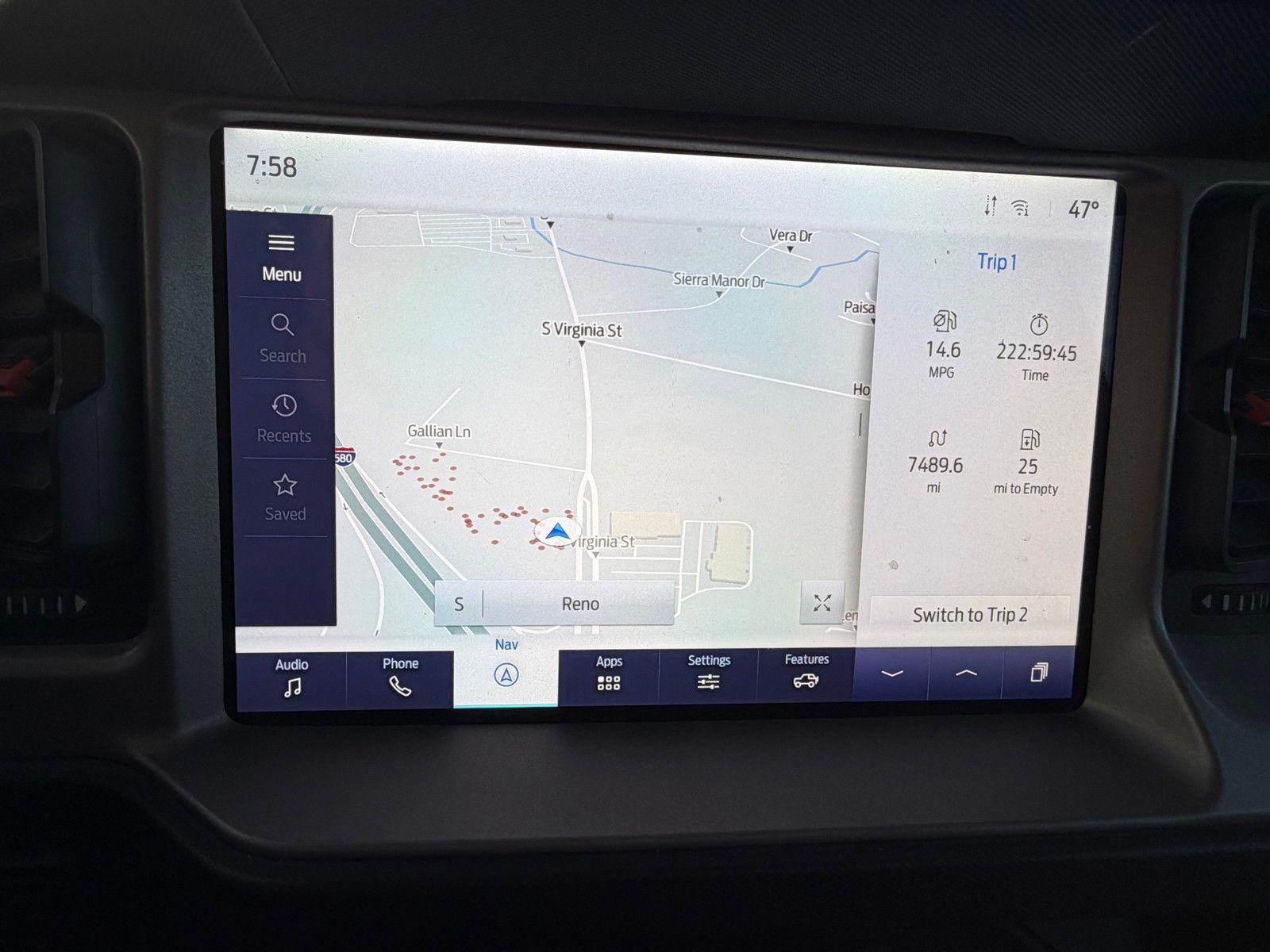 Welcome to Land Rover Reno. All of our preowned vehicles are hand picked and inspected for your peace of mind. Please contact us directly @ 775-332-4000 or email direct to jlrassistance@findlayauto.com This Ford Bronco is equipped with the following options and extra equipment: Equipment Group 374A High/Lux Package, 10 Speakers, 4-Wheel Disc Brakes, ABS brakes, Air Conditioning, Alloy wheels, AM/FM radio: SiriusXM with 360L, Auto High-beam Headlights, Auto-dimming Rear-View mirror, Automatic temperature control, Brake assist, Compass, Connected Navigation, Convertible HardTop, Convertible roof lining, Delay-off headlights, Driver door bin, Driver vanity mirror, Dual front impact airbags, Dual front side impact airbags, Electronic Stability Control, Emergency communication system: 911 Assist, Exterior Parking Camera Rear, Front anti-roll bar, Front Bucket Seats, Front Center Armrest, Front dual zone A/C, Front fog lights, Front License Plate Bracket, Front reading lights, Front Row Top Panels & Door Storage Bags, Front wheel independent suspension, Fully automatic headlights, Garage door transmitter, Glass rear window, Heated door mirrors, Heated front seats, Heated steering wheel, Illuminated entry, Integrated roll-over protection, Interior Carbon Fiber Pack 6, Leather Shift Knob, Low tire pressure warning, Marine Grade Vinyl Bucket Seats, Navigation system: Connected Navigation, Occupant sensing airbag, Outside temperature display, Overhead airbag, Overhead console, Panic alarm, Passenger door bin, Passenger vanity mirror, Power door mirrors, Power steering, Power windows, Radio data system, Radio: B&O Sound System by Bang & Olufsen, Rear anti-roll bar, Rear seat center armrest, Rear window defroster, Rear window wiper, Remote keyless entry, Security system, SiriusXM Radio w/360L, Speed control, Split folding rear seat, Steering wheel mounted audio controls, SYNC 4, Tachometer, Telescoping steering wheel, Tilt steering wheel, Traction control, Trip computer, Turn signal indicator mirrors, Variably intermittent wipers, Voltmeter, and Wheels: 17"" Black High Gloss-Painted AluminuM.4WD 10-Speed Automatic 3.0L EcoBoost V6