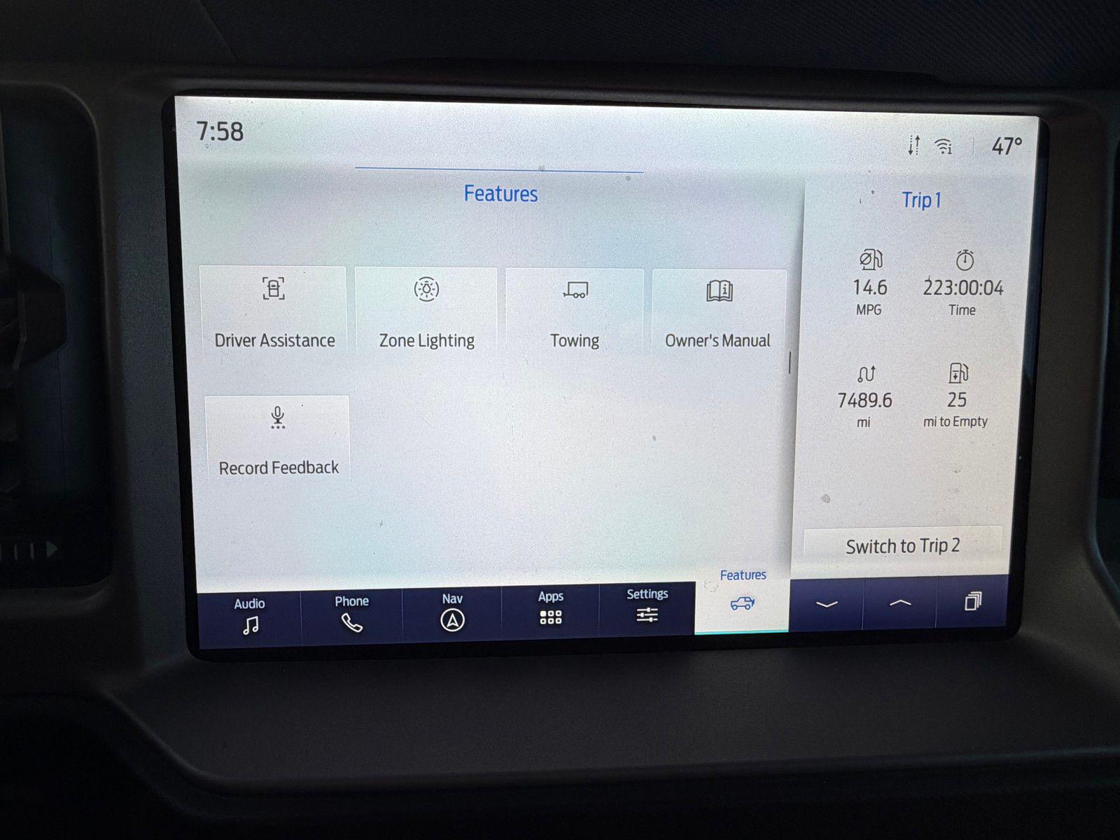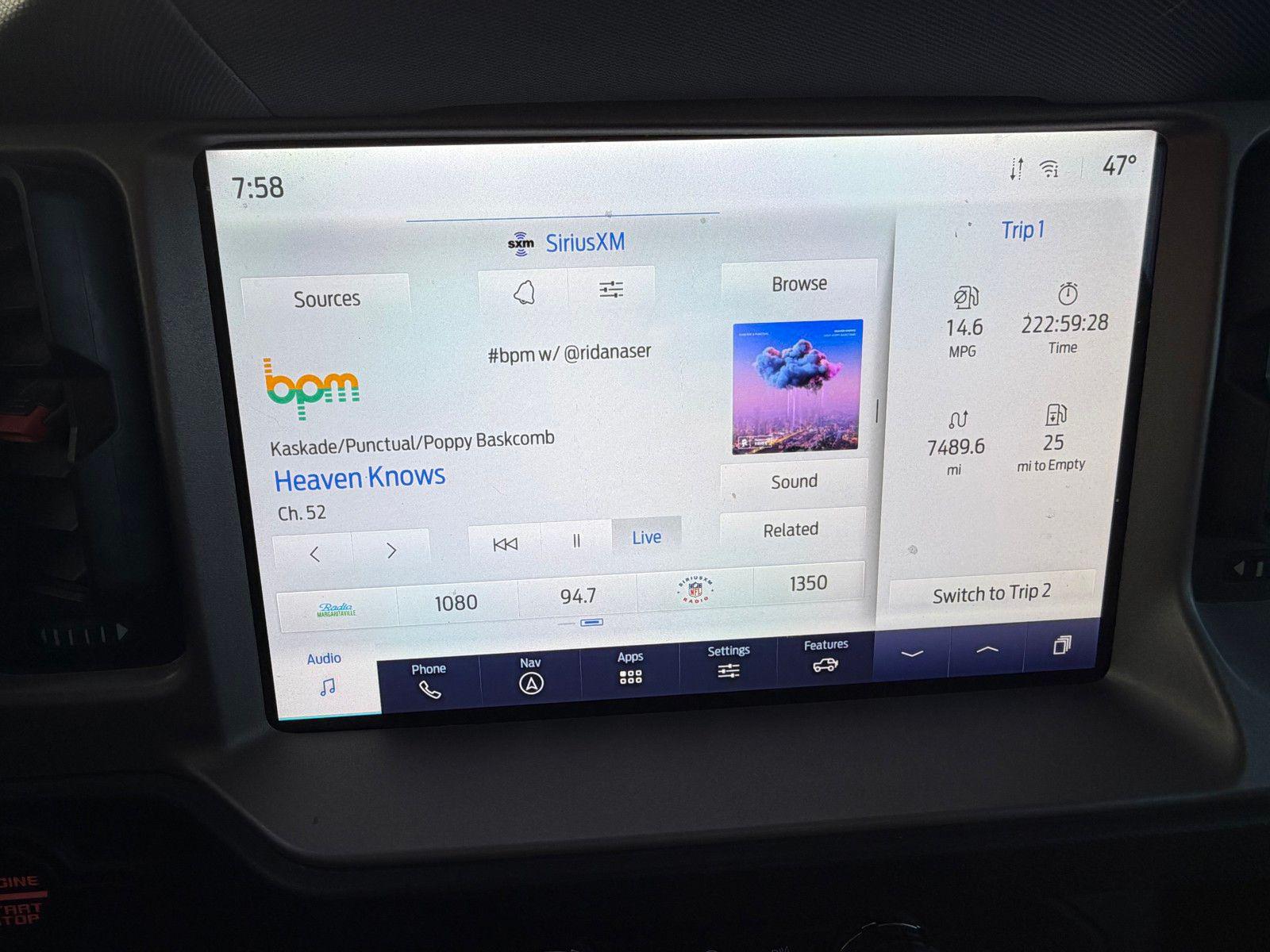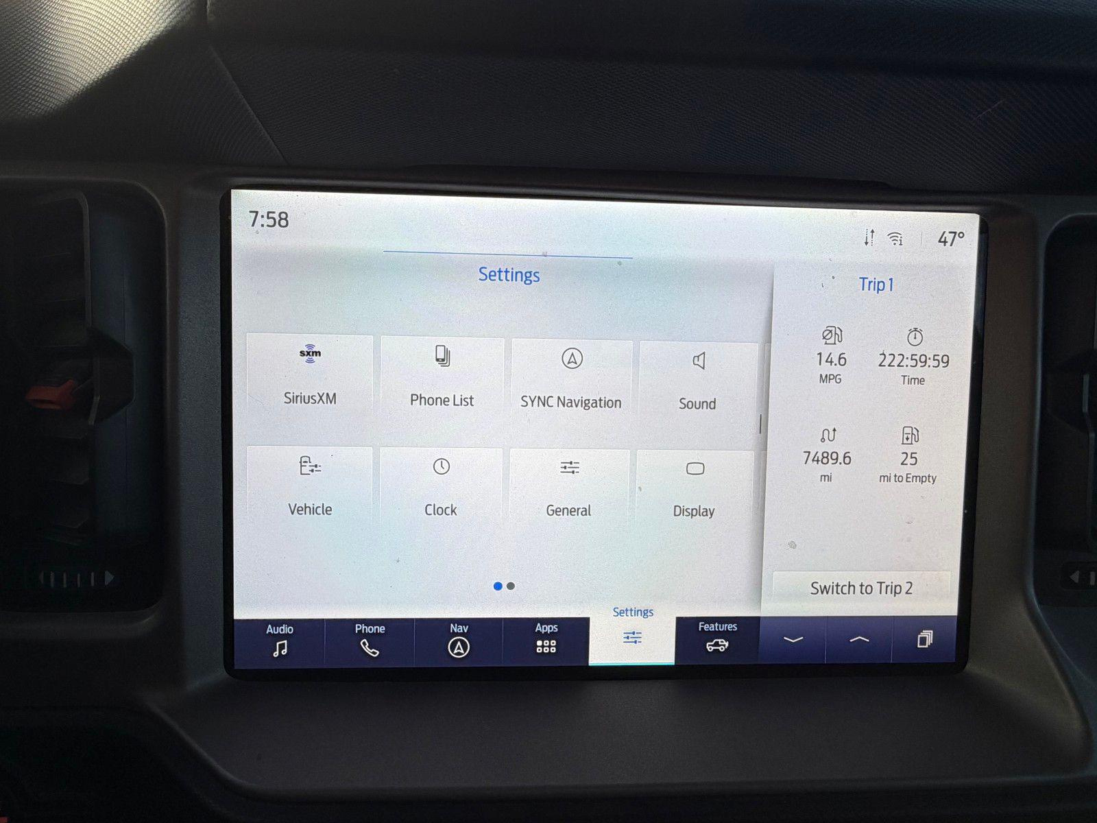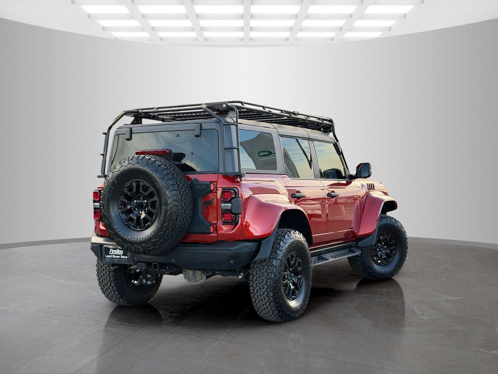 Welcome to Land Rover Reno. All of our preowned vehicles are hand picked and inspected for your peace of mind. Please contact us directly @ 775-332-4000 or email direct to jlrassistance@findlayauto.com This Ford Bronco is equipped with the following options and extra equipment: Equipment Group 374A High/Lux Package, 10 Speakers, 4-Wheel Disc Brakes, ABS brakes, Air Conditioning, Alloy wheels, AM/FM radio: SiriusXM with 360L, Auto High-beam Headlights, Auto-dimming Rear-View mirror, Automatic temperature control, Brake assist, Compass, Connected Navigation, Convertible HardTop, Convertible roof lining, Delay-off headlights, Driver door bin, Driver vanity mirror, Dual front impact airbags, Dual front side impact airbags, Electronic Stability Control, Emergency communication system: 911 Assist, Exterior Parking Camera Rear, Front anti-roll bar, Front Bucket Seats, Front Center Armrest, Front dual zone A/C, Front fog lights, Front License Plate Bracket, Front reading lights, Front Row Top Panels & Door Storage Bags, Front wheel independent suspension, Fully automatic headlights, Garage door transmitter, Glass rear window, Heated door mirrors, Heated front seats, Heated steering wheel, Illuminated entry, Integrated roll-over protection, Interior Carbon Fiber Pack 6, Leather Shift Knob, Low tire pressure warning, Marine Grade Vinyl Bucket Seats, Navigation system: Connected Navigation, Occupant sensing airbag, Outside temperature display, Overhead airbag, Overhead console, Panic alarm, Passenger door bin, Passenger vanity mirror, Power door mirrors, Power steering, Power windows, Radio data system, Radio: B&O Sound System by Bang & Olufsen, Rear anti-roll bar, Rear seat center armrest, Rear window defroster, Rear window wiper, Remote keyless entry, Security system, SiriusXM Radio w/360L, Speed control, Split folding rear seat, Steering wheel mounted audio controls, SYNC 4, Tachometer, Telescoping steering wheel, Tilt steering wheel, Traction control, Trip computer, Turn signal indicator mirrors, Variably intermittent wipers, Voltmeter, and Wheels: 17"" Black High Gloss-Painted AluminuM.4WD 10-Speed Automatic 3.0L EcoBoost V6