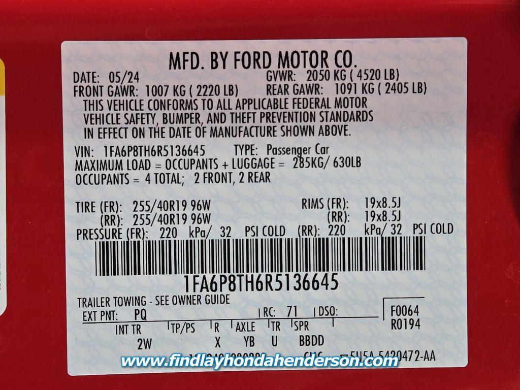 Welcome to Findlay Honda in Henderson. All of our cars are hand picked and inspected for your peace of mind. This Mustang is equipped with the following options:Wheel & Stripe Package, Wheels: 19"" x 8.5"" Machined-Face Aluminum.EcoBoost Race Red RWD 10-Speed Automatic EcoBoost 2.3L I4 GTDi DOHC Turbocharged VCTOdometer is 7518 miles below market average! 22/33 City/Highway MPG