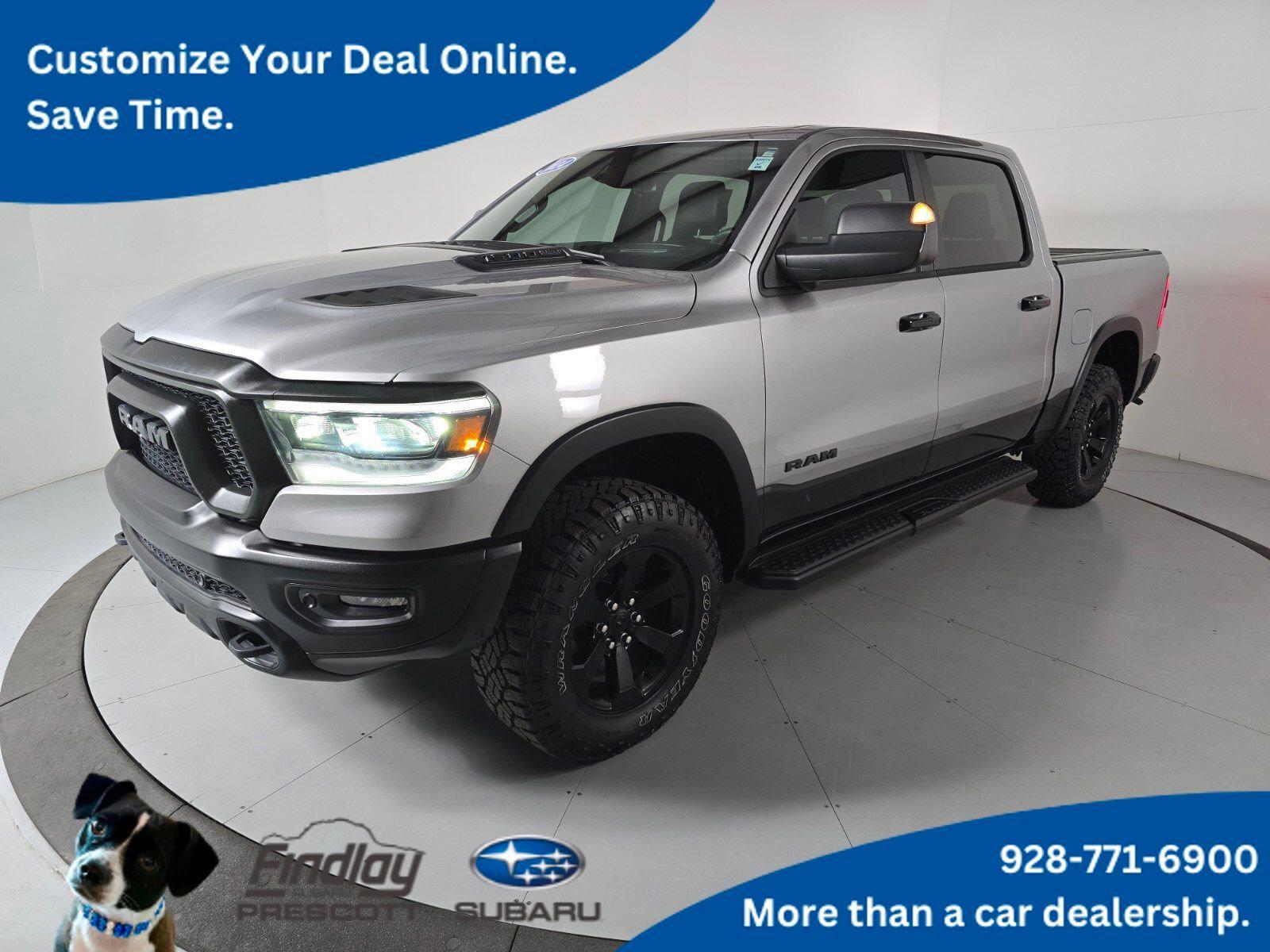 1500 Rebel, 4D Crew Cab, HEMI 5.7L V8 Multi Displacement VVT eTorque, 8-Speed Automatic, 4WD, Billet Silver Metallic Clearcoat, Red/Black Leather.Visit with our NON-Commission team, for a hassle free experience! Save more with Findlay Subaru Prescott, with our competitive, market based pricing! This Ram 1500 is equipped with the following features: Advanced Safety Group (Adaptive Cruise Control w/Stop & Go, Auto High Beam Headlamp Control, Lane Keep Assist, Parallel & Perp Park Assist w/Stop, Pedestrian Emergency Braking, and Surround View Camera System), Bed Utility Group (MOPAR 4 Adjustable Cargo Tie-Down Hooks and Pick-Up Box Lighting), Comfort/Convenience Group (Exterior Mirrors w/Memory, Heated Second Row Seats, Power 8-Way Driver & Passenger Seats, Remote Tailgate Release, and Wireless Charging Pad), Night Edition (Black Front Bumper w/Black Plate, Grille Surround 2 Black Texture 3 Black, RAM Grille Badge - Black, and Wheels: 18 x 8.0 Gloss Black), Quick Order Package 27W Rebel, Rebel Level 2 Equipment Group (115V Auxiliary Rear Power Outlet, 2-Door Passive Entry, Front Door Locks, 2nd Row In Floor Storage Bins, 4G LTE Wi-Fi Hot Spot, Accent Color Door Handles, Apple CarPlay, Auto-Dimming Exterior Driver Mirror, Black Premium Power Mirrors, Connected Travel & Traffic Services, Connectivity - US/Canada, Convex Wide-Angle Exterior Mirror Insert, Exterior Mirrors Courtesy Lamps, Exterior Mirrors w/Heating Element, Exterior Mirrors w/Supplemental Signals, Foam Bottle Insert (Door Trim Panel), For Details, Visit DriveUconnect.com, For More Info, Call 800-643-2112, Global Telematics Box Module (TBM), Google Android Auto, GPS Navigation, harman/kardon 19 Speaker Premium Sound, HD Radio, Heated Front Seats, Heated Steering Wheel, Integrated Voice Command w/Bluetooth, Media Hub w/2 Charge Only USBs, Off-Road Information Pages, ParkSense Front/Rear Park Assist w/Stop, Power 2-Way Driver Lumbar Adjust, Power 8-Way Driver Seat, Power Adjustable Pedals, Power-Folding Mirrors, Radio: Uconnect 5 Nav w/12.0 Display, Rain Sensitive Windshield Wipers, Rear Dome w/On/Off Switch Lamp, Rear Power Sliding Window, Rear Underseat Compartment Storage, Rear Window Defroster, Remote Start System, Security Alarm, SiriusXM Radio Service, SiriusXM w/360L, Sun Visors w/Illuminated Vanity Mirrors, Universal Garage Door Opener, and USB Host Flip), Technology Group (Digital Rearview Mirror, Heads-Up Display, and LED CHMSL Lamp), Trailer Tow Group (Mirror Clearance/Running Lights, Mirror-Mounted Aux Reverse Lamps, Trailer Brake Control, Trailer Light Check, Trailer Reverse Steering Control, and Trailer Tire Pressure Monitoring System), 1500 Rebel, 4D Crew Cab, HEMI 5.7L V8 Multi Displacement VVT eTorque, 8-Speed Automatic, 4WD, Billet Silver Metallic Clearcoat, Red/Black Leather, 3.92 Rear Axle Ratio, 33 Gallon Fuel Tank, 4 Way Front Headrests, 4-Corner Air Suspension, 4-Wheel Disc Brakes, 48V Belt Starter Generator, 6 Speakers, ABS brakes, Air Conditioning, Alloy wheels, AM/FM radio: SiriusXM with 360L, Apple CarPlay/Android Auto, Auto-dimming Rear-View mirror, Automatic temperature control, Blind Spot & Cross Path Detection, Brake assist, Bucket Seats, Class IV Receiver Hitch, Cloth/Vinyl Low Back Bucket Seats, Compass, Delay-off headlights, Dome Dual LED Reading Lamp, Driver door bin, Dual front impact airbags, Dual front side impact airbags, Dual-Pane Panoramic Sunroof, Electric Shift-On-Demand Transfer Case, Electronic Stability Control, Emergency communication system: RAM Connect, Front anti-roll bar, Front Bucket Seats, Front Center Armrest w/Storage, Front dual zone A/C, Front fog lights, Front reading lights, Front Seat Back Map Pockets, Front wheel independent suspension, Full Length Upgraded Floor Console, Fully automatic headlights, Heated door mirrors, Illuminated entry, Instrument Cluster Theme 2 - Rebel, Leather steering wheel, Low tire pressure warning, Manufacturer's Statement of Origin, Mopar Black Tubular Side Steps, MOPAR Sp
