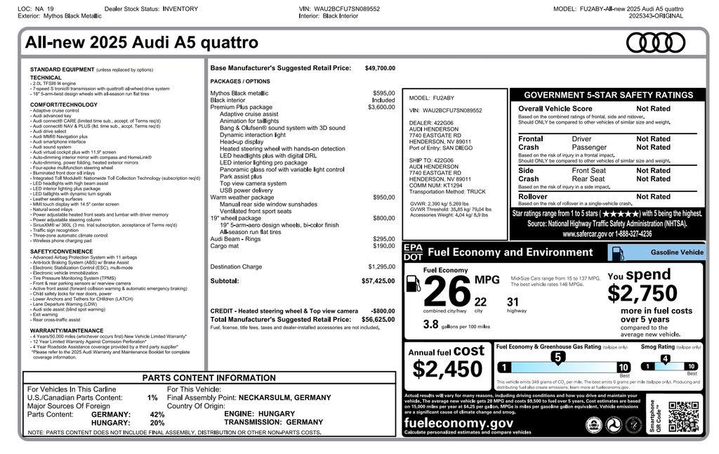 At Audi Henderson, our goal is to provide our customers with a Dealership experience that is unmatched in the Automotive Industry. Whether it's sales or service, parts or accessories, it is our goal to do our best for you on each and every visit. We believe Audi vehicles are some of the finest on the road today and our passion for what we do is obvious from the moment you set foot in our store. We've refined our processes, continually train our staff and take pride in what we do in effort to redefine the typical car-buying experience. Visit Audi Henderson today and experience the difference.2025 Audi A5 quattro quattroMythos Black Metallic 2.0L 4-Cylinder TFSI 4D HatchbackThis Audi A5 is equipped with the following features: quattro and Black Leather.*Full Safety Inspection, *All Scheduled Service Up to Date, quattro, Black Leather.