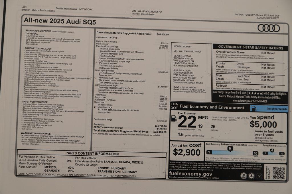 At Audi Henderson, our goal is to provide our customers with a Dealership experience that is unmatched in the Automotive Industry. Whether it's sales or service, parts or accessories, it is our goal to do our best for you on each and every visit. We believe Audi vehicles are some of the finest on the road today and our passion for what we do is obvious from the moment you set foot in our store. We've refined our processes, continually train our staff and take pride in what we do in effort to redefine the typical car-buying experience. Visit Audi Henderson today and experience the difference.2025 Audi SQ5 3.0T Premium Plus quattro quattroMythos Black Metallic 3.0L TFSI 4D Sport UtilityThis Audi SQ5 is equipped with the following features:*Full Safety Inspection, *All Scheduled Service Up to Date.