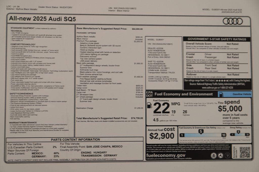 At Audi Henderson, our goal is to provide our customers with a Dealership experience that is unmatched in the Automotive Industry. Whether it's sales or service, parts or accessories, it is our goal to do our best for you on each and every visit. We believe Audi vehicles are some of the finest on the road today and our passion for what we do is obvious from the moment you set foot in our store. We've refined our processes, continually train our staff and take pride in what we do in effort to redefine the typical car-buying experience. Visit Audi Henderson today and experience the difference.2025 Audi SQ5 3.0T Premium Plus quattro quattroMythos Black Metallic 3.0L TFSI 4D Sport UtilityThis Audi SQ5 is equipped with the following features:*Full Safety Inspection, *All Scheduled Service Up to Date.