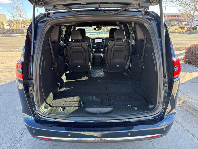 CARFAX One-Owner. Fathom Blue Pearlcoat 2025 Chrysler Pacifica Select 4D Passenger Van FWD 9-Speed 948TE Automatic 3.6L V6 24V VVT10.1" Touchscreen Display, 17" x 7.0" Aluminum Wheels, 3.25 Axle Ratio, 3rd row seats: split-bench, 4-Wheel Disc Brakes, 4G LTE Wi-Fi Hot Spot, 6 Speakers, ABS brakes, Air Conditioning, Alloy wheels, AM/FM radio: SiriusXM, Apple CarPlay, Apple CarPlay/Android Auto, Auto-dimming Rear-View mirror, Automatic temperature control, Black Seats, Brake assist, Bumpers: body-color, Caprice Leatherette Bucket Seats, Compass, Delay-off headlights, Disassociated Touchscreen Display, Driver door bin, Driver vanity mirror, Driver's Seat Mounted Armrest, Dual front impact airbags, Dual front side impact airbags, Electronic Stability Control, Emergency communication system: Chrysler Connect, For Details, Visit DriveUconnect.com, Four wheel independent suspension, Front anti-roll bar, Front Bucket Seats, Front dual zone A/C, Front Fascia Air Deflectors, Front fog lights, Front reading lights, Fully automatic headlights, Garage door transmitter, Google Android Auto, GPS Antenna Input, Heated door mirrors, Heated front seats, Heated steering wheel, Illuminated entry, Integrated Active Noise Cancellation, Integrated Center Stack Radio, Knee airbag, Low tire pressure warning, Manufacturer's Statement of Origin, Memory seat, Occupant sensing airbag, Outside temperature display, Overhead airbag, Overhead console, Panic alarm, ParkView Rear Back-Up Camera, Passenger door bin, Passenger seat mounted armrest, Passenger vanity mirror, Power door mirrors, Power driver seat, Power Liftgate, Power steering, Power windows, Quick Order Package 27L, Radio data system, Radio: Uconnect 5 with 10.1" Display, Rain sensing wipers, Rear air conditioning, Rear reading lights, Rear window defroster, Rear window wiper, Reclining 3rd row seat, Remote keyless entry, Security system, SiriusXM Guardian - Included Trial (B), Speed control, Split folding rear seat, Spoiler, Steering wheel mounted audio controls, Tachometer, Telescoping steering wheel, Tilt steering wheel, Touring Suspension, Traction control, Trip computer, Turn signal indicator mirrors, USB Host Flip, Variably intermittent wipers, Voltmeter. 19/28 City/Highway MPG