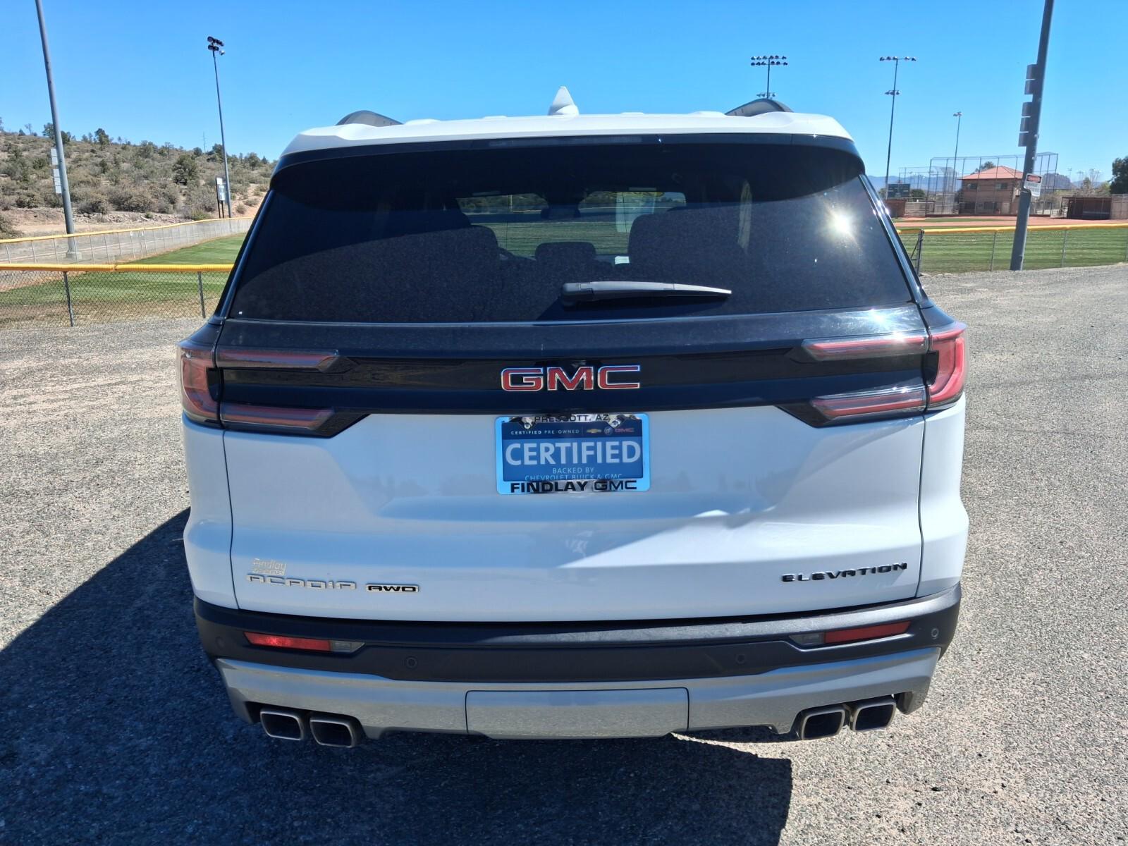 Welcome to Findlay GMC in Prescott, AZ. We have multiple locations with over 600 cars in stock. If you are looking for something specific that this Acadia doesn't have, please contact us directly. This GMC Acadia is equipped with the following options: Preferred Equipment Group 4SD, GMC Certified Pre-Owned Certified, AWD, After Dark Cloth, 12 Speakers, 18'' x 7.5'' Aluminum Wheels, 2-Way Driver Power Lumbar Seat Adjuster, 3.49 Final Drive Axle Ratio, 3rd row seats: split-bench, 4-Way Manual Front Passenger Seat Adjuster, 4-Wheel Disc Brakes, 8-Passenger Seating (2-3-3 Seating Configuration), 8-Way Power Driver Seat Adjuster, ABS brakes, Air Conditioning, Alloy wheels, AM/FM radio: SiriusXM with 360L, Apple CarPlay/Android Auto, Auto High-beam Headlights, Auto-dimming Rear-View mirror, Automatic temperature control, Bodyside moldings, Bose Premium 12-Speaker System with Sub-Woofer, Brake assist, Bumpers: body-color, Cloth Seat Trim, Compass, Delay-off headlights, Driver door bin, Driver vanity mirror, Dual front impact airbags, Dual front side impact airbags, Electronic Stability Control, Emergency communication system: OnStar Services capable, Exterior Parking Camera Rear, Four wheel independent suspension, Front anti-roll bar, Front Bucket Seats, Front Center Armrest, Front dual zone A/C, Front fog lights, Front License Plate Bracket, Front reading lights, Fully automatic headlights, Heated door mirrors, Heated Driver and Front Passenger Seats, Heated front seats, Heated steering wheel, Illuminated entry, Leather steering wheel, Low tire pressure warning, Navigation System, Occupant sensing airbag, Outside temperature display, Overhead airbag, Overhead console, Panic alarm, Passenger door bin, Passenger vanity mirror, Power door mirrors, Power driver seat, Power Liftgate, Power steering, Power windows, Radio data system, Radio: 15'' Diagonal Premium GMC Infotainment System, Rear air conditioning, Rear anti-roll bar, Rear reading lights, Rear seat center armrest, Re