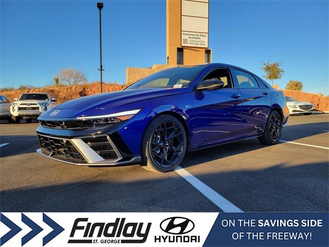 At Findlay Hyundai we know your time and money is valuable. That's why we advertise all our pre-owned vehicles with the best price right up front! Our Sales team is NON-Commissioned based, so their focus is to help you find the car that best fits your wants and needs! NO hidden fees or games. You can pay cash, finance with us, or finance on your own. We can finance through your preferred bank or credit union directly from the dealership saving you an extra trip.Intense Blue 2025 Hyundai Elantra N Line I4 7-Speed Dual Clutch DCT FWDFor more information about this vehicle or to schedule a test drive, please contact our Sales staff at # 435-688-7272 or stop by our brand new store located at 1145 E TWIN ROCKS COVE, WASHINGTON, UT 84780! **HABLAMOS ESPANOL*** This Hyundai Elantra N Line is equipped with the following features: Option Group 01, 18"" x 7.5J Alloy Wheels, 4-Wheel Disc Brakes, 8 Speakers, ABS brakes, Air Conditioning, All-Season Fitted Liners, Alloy wheels, AM/FM radio: SiriusXM, Apple CarPlay & Android Auto, Auto High-beam Headlights, Automatic temperature control, Brake assist, Bumpers: body-color, Cargo Net, Carpeted Floor Mats, Combination Cloth & Leatherette Seating Surfaces, Delay-off headlights, Driver door bin, Driver vanity mirror, Dual front impact airbags, Dual front side impact airbags, Electronic Stability Control, Emergency communication system: Bluelink+, Exterior Parking Camera Rear, First Aid Kit, Four wheel independent suspension, Front anti-roll bar, Front Bucket Seats, Front Center Armrest, Front dual zone A/C, Front reading lights, Fully automatic headlights, Heated door mirrors, Heated front seats, Heated Front Sport Bucket Seats, Illuminated entry, Leather Shift Knob, Leather steering wheel, Low tire pressure warning, Navigation System, Occupant sensing airbag, Outside temperature display, Overhead airbag, Overhead console, Panic alarm, Passenger door bin, Passenger vanity mirror, Power door mirrors, Power driver seat, Power moonroof, Power steering, Power windows, Radio: AM/FM/HD/SiriusXM Display Audio, Rear anti-roll bar, Rear seat center armrest, Rear side impact airbag, Rear window defroster, Remote keyless entry, Security system, Speed control, Speed-sensing steering, Split folding rear seat, Spoiler, Sport steering wheel, Steering wheel mounted audio controls, Tachometer, Telescoping steering wheel, Tilt steering wheel, Traction control, Trip computer, Turn signal indicator mirrors, and Variably intermittent wipers.