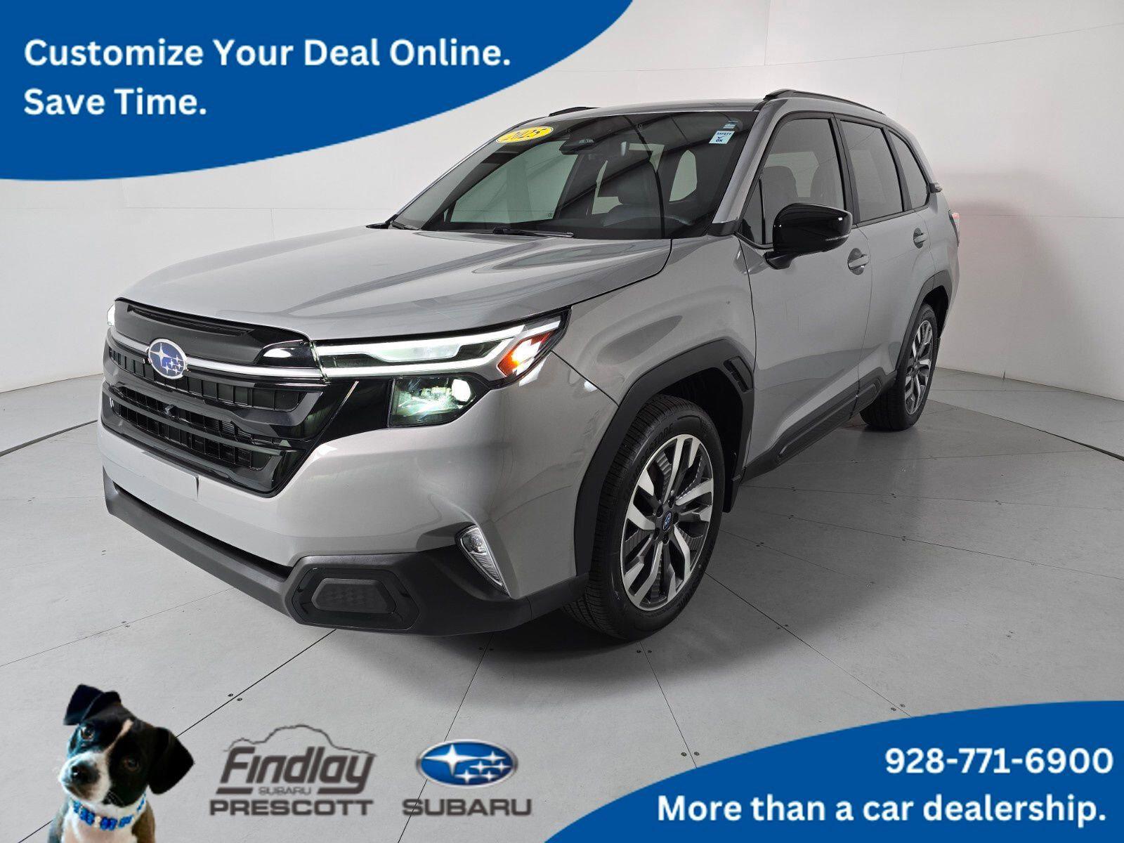 Forester Touring, 4D Sport Utility, 2.5L 4-Cylinder DOHC 16V, Lineartronic CVT, AWD, River Rock Pearl, Black Leather.Visit with our NON-Commission team, for a hassle free experience! Save more with Findlay Subaru Prescott, with our competitive, market based pricing! This Subaru Forester is equipped with the following features: Protection Package (All-Weather Floor Liners, Cargo Tray, Rear Bumper Cover, and Splash Guards), Standard Model, Forester Touring, 4D Sport Utility, 2.5L 4-Cylinder DOHC 16V, Lineartronic CVT, AWD, River Rock Pearl, Black Leather, 11 Speakers, 4-Wheel Disc Brakes, ABS brakes, Air Conditioning, Alloy wheels, AM/FM radio: SiriusXM with 360L, Anti-whiplash front head restraints, Auto High-beam Headlights, Auto-Dimming Exterior Mirror w/Approach Light, Automatic temperature control, Brake assist, Bumpers: body-color, Driver door bin, Driver vanity mirror, Dual front impact airbags, Dual front side impact airbags, Electronic Stability Control, Emergency communication system: MySubaru Safety (3-year free trial), Exterior Parking Camera Rear, Four wheel independent suspension, Front anti-roll bar, Front Bucket Seats, Front Center Armrest, Front dual zone A/C, Front fog lights, Front reading lights, Fully automatic headlights, harman/kardon® Speakers, Heated & Ventilated Front Bucket Seats, Heated door mirrors, Heated front seats, Heated rear seats, Heated steering wheel, HVAC memory, Illuminated entry, Knee airbag, Leather steering wheel, LED Upgrade, Low tire pressure warning, Memory seat, Navigation System, Occupant sensing airbag, Outside temperature display, Overhead airbag, Overhead console, Panic alarm, Passenger door bin, Passenger vanity mirror, Perforated Leather-Trimmed Upholstery, Power door mirrors, Power driver seat, Power Liftgate, Power moonroof: Panoramic, Power passenger seat, Power steering, Power windows, Radio data system, Radio: Subaru 11.6 Multimedia Navigation System, Rear anti-roll bar, Rear seat center armrest, Rear Seatback Protector, Rear window defroster, Rear window wiper, Remote keyless entry, Security system, Speed control, Speed-sensing steering, Split folding rear seat, Spoiler, Steering wheel mounted audio controls, Tachometer, Telescoping steering wheel, Tilt steering wheel, Traction control, Trip computer, Turn signal indicator mirrors, Variably intermittent wipers, Ventilated front seats, and Wheels: 19 x 7.5 J Dark Gray Aluminum-Alloy.CARFAX One-Owner. Clean CARFAX.We use Market Based Pricing to give you the best price, upfront, without games. We do the shopping, so you get the deals!2025 Subaru Forester Touring 25/32 City/Highway MPG Odometer is 7496 miles below market average!