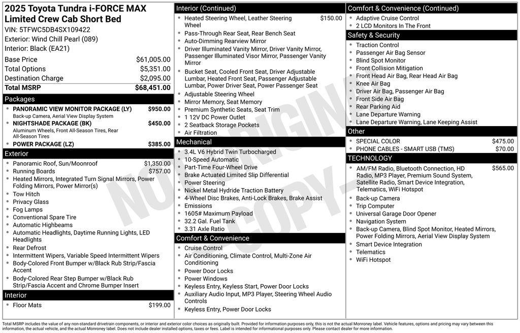 Elevate your driving experience with the exceptional 2025 Toyota Tundra Hybrid Hybrid Limited. This remarkable vehicle combines the power and capability of a full-size truck with the efficiency and eco-friendliness of a hybrid powertrain, making it the perfect choice for those who demand both performance and sustainability.- Power Panoramic Roof with tilt/slide and power sunshade- Panoramic View Monitor Package with Panoramic View Back Monitor- Predator Drop Step- Premium Audio System with JBL- Nightshade Package with gloss-black accents and 20"" matte-black alloy wheels- Power Package with 400W/120V AC Rear Seat & Bed Power Supply and Qi-Compatible Wireless Smartphone ChargerBeneath the striking exterior, the Tundra Hybrid is powered by a 3.4L V6 engine and a 10-speed automatic transmission, delivering an impressive 20 city/24 highway MPG. This advanced hybrid system not only enhances fuel efficiency but also provides exceptional power and responsiveness, ensuring you can tackle any task with confidence.The interior of the Tundra Hybrid Limited is a true oasis of comfort and convenience. Heated and ventilated leather-trimmed front seats, a heated leather-wrapped steering wheel, and dual-zone automatic climate control create a luxurious environment, while the premium audio system with JBL speakers and the panoramic sunroof elevate the driving experience.Safety is also a top priority, with features like the Panoramic View Monitor, Auto High-Beam Headlights, and Toyota Safety Sense 2.5+ suite of advanced driver-assistance technologies keeping you and your passengers secure on the road.Whether you're hauling heavy loads, embarking on off-road adventures, or simply enjoying the daily commute, the 2025 Toyota Tundra Hybrid Hybrid Limited is the perfect companion. Experience the perfect blend of power, efficiency, and luxury by scheduling a test drive at our showroom today.