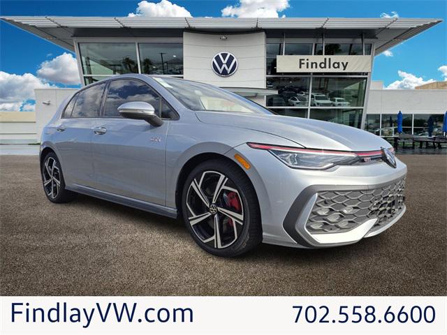 Alpine Silver 2025 Volkswagen Golf GTI 2.0T SE FWD 7-Speed DSG Automatic with Tiptronic 2.0L TSI DOHC 4-Wheel Disc Brakes, 9 Speakers, ABS brakes, Air Conditioning, AM/FM radio: SiriusXM with 360L, ArtVelours Seating Surfaces, Auto High-beam Headlights, Auto-dimming Rear-View mirror, Automatic temperature control, Brake assist, Bumpers: body-color, Compass, Custom 20"" Black Wheels, Delay-off headlights, Driver door bin, Driver vanity mirror, Dual front impact airbags, Dual front side impact airbags, Electronic Stability Control, Emergency communication system: VW Car-Net Safe & Secure 5-year, Exterior Parking Camera Rear, Forward collision: FCW w/Autonomous Emergency Braking mitigation, Four wheel independent suspension, Front anti-roll bar, Front Bucket Seats, Front Center Armrest, Front fog lights, Front reading lights, Fully automatic headlights, harman/kardon® Speakers, Heated door mirrors, Heated front seats, Heated Front Top Sport Seats, Heated steering wheel, Illuminated entry, Leather steering wheel, Low tire pressure warning, Navigation System, Occupant sensing airbag, Outside temperature display, Overhead airbag, Overhead console, Panic alarm, Passenger door bin, Passenger vanity mirror, Power door mirrors, Power driver seat, Power moonroof: Panoramic, Power passenger seat, Power steering, Power windows, Radio data system, Radio: MIB3 Discover Pro AM/FM/HD With12.9"" Touchscreen Navigation, Rain sensing wipers, Rear anti-roll bar, Rear reading lights, Rear seat center armrest, Rear window defroster, Rear window wiper, Remote keyless entry, Rubber Monster Mats (set of 4), Security system, Speed control, Speed-sensing steering, Speed-Sensitive Wipers, Split folding rear seat, Spoiler, Sport steering wheel, Steering wheel mounted audio controls, Tachometer, Telescoping steering wheel, Tilt steering wheel, Traction control, Trip computer, Turn signal indicator mirrors, Variably intermittent wipers, VW Care, Wheels: 18"" 2-Tone Diamond-Turned Alloy.24/32 City/Highway MPG
