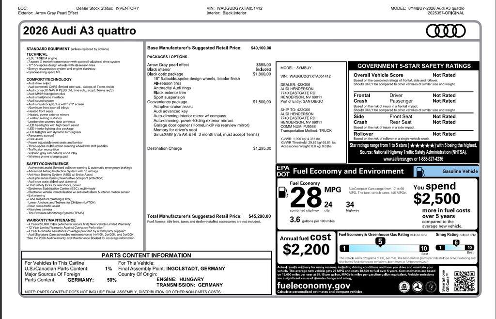 At Audi Henderson, our goal is to provide our customers with a Dealership experience that is unmatched in the Automotive Industry. Whether it's sales or service, parts or accessories, it is our goal to do our best for you on each and every visit. We believe Audi vehicles are some of the finest on the road today and our passion for what we do is obvious from the moment you set foot in our store. We've refined our processes, continually train our staff and take pride in what we do in effort to redefine the typical car-buying experience. Visit Audi Henderson today and experience the difference.2026 Audi A3 40 Premium quattro quattroArrow Gray Pearl Effect 2.0L 4-Cylinder TFSI 4D SedanThis Audi A3 is equipped with the following features: quattro and Black Leather.quattro, Black Leather.