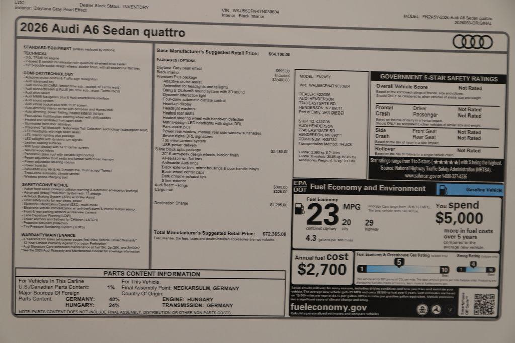 At Audi Henderson, our goal is to provide our customers with a Dealership experience that is unmatched in the Automotive Industry. Whether it's sales or service, parts or accessories, it is our goal to do our best for you on each and every visit. We believe Audi vehicles are some of the finest on the road today and our passion for what we do is obvious from the moment you set foot in our store. We've refined our processes, continually train our staff and take pride in what we do in effort to redefine the typical car-buying experience. Visit Audi Henderson today and experience the difference.2026 Audi A6 3.0 quattro quattroDaytona Gray Pearl Effect 3.0L V6 Turbocharged DOHC 24V LEV3-ULEV70 362hp 4D SedanThis Audi A6 is equipped with the following features: quattro and Black Leather.*Full Safety Inspection, *All Scheduled Service Up to Date, quattro, Black Leather.