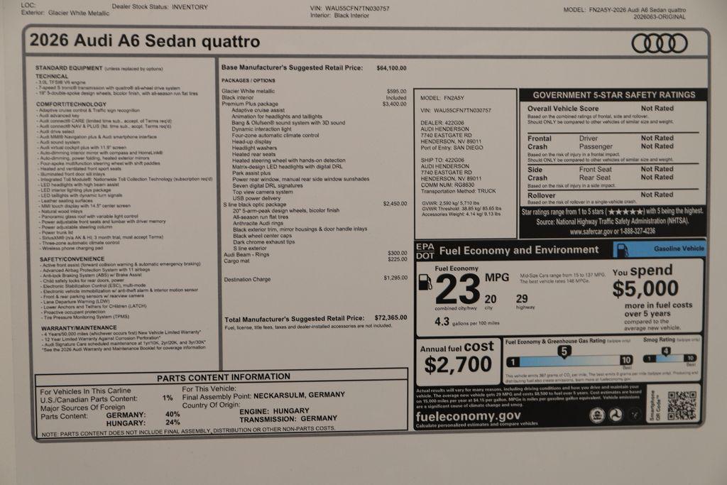 At Audi Henderson, our goal is to provide our customers with a Dealership experience that is unmatched in the Automotive Industry. Whether it's sales or service, parts or accessories, it is our goal to do our best for you on each and every visit. We believe Audi vehicles are some of the finest on the road today and our passion for what we do is obvious from the moment you set foot in our store. We've refined our processes, continually train our staff and take pride in what we do in effort to redefine the typical car-buying experience. Visit Audi Henderson today and experience the difference.2026 Audi A6 3.0 quattro quattroGlacier White Metallic 3.0L V6 Turbocharged DOHC 24V LEV3-ULEV70 362hp 4D SedanThis Audi A6 is equipped with the following features: quattro and Black Leather.*Full Safety Inspection, *All Scheduled Service Up to Date, quattro, Black Leather.