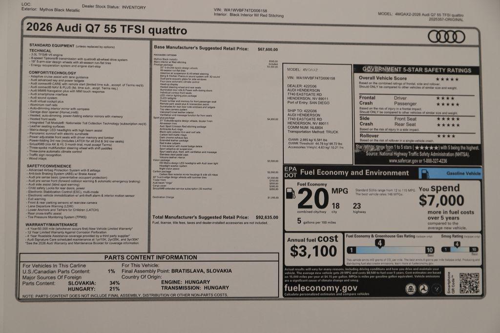 At Audi Henderson, our goal is to provide our customers with a Dealership experience that is unmatched in the Automotive Industry. Whether it's sales or service, parts or accessories, it is our goal to do our best for you on each and every visit. We believe Audi vehicles are some of the finest on the road today and our passion for what we do is obvious from the moment you set foot in our store. We've refined our processes, continually train our staff and take pride in what we do in effort to redefine the typical car-buying experience. Visit Audi Henderson today and experience the difference.2026 Audi Q7 55 Prestige quattro quattroMythos Black Metallic 3.0L TFSI 4D Sport UtilityThis Audi Q7 is equipped with the following features:*Full Safety Inspection, *All Scheduled Service Up to Date.
