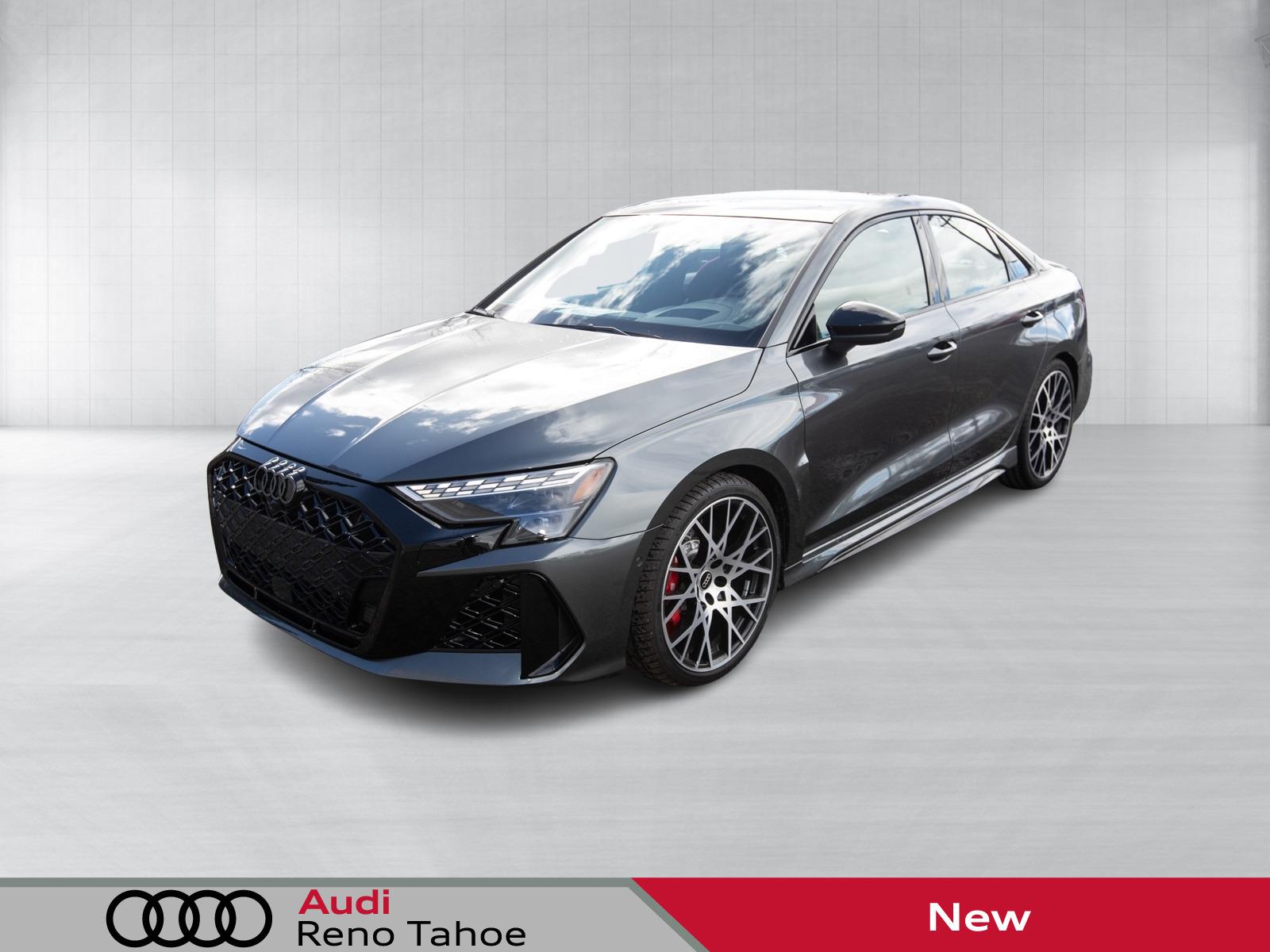 Daytona Gray Pearl Effect 2026 Audi RS 3 2.5T quattro quattro 7-Speed Automatic S tronic 2.5L 5-Cylinder TFSI 15 Speakers, 4-Wheel Disc Brakes, ABS brakes, Adaptive suspension, Air Conditioning, Alloy wheels, AM/FM radio: SiriusXM(R) with 360L, Audi Connect CARE, Audi Guard All-Weather Mats, Auto High-beam Headlights, Auto-dimming door mirrors, Auto-dimming Rear-View mirror, Automatic temperature control, Brake assist, Bumpers: body-color, Compass, Delay-off headlights, Driver door bin, Driver vanity mirror, Dual front impact airbags, Dual front side impact airbags, Electronic Stability Control, Emergency communication system: Audi connect CARE, Exterior Parking Camera Rear, Fine Nappa Leather Seating Surfaces with Honeycomb Stichting, Floor Mats w/RS Logo & Express Red Stitching on Piping, Four wheel independent suspension, Front anti-roll bar, Front Bucket Seats, Front Center Armrest, Front dual zone A/C, Front reading lights, Garage door transmitter: HomeLink, Headlight cleaning, Heads-Up Display, Heated door mirrors, Heated Front S Sport Seats, Heated front seats, Illuminated entry, Knee airbag, Leather steering wheel, Low tire pressure warning, Memory seat, Navigation system: Audi MMI Navigation with Touch Response, Occupant sensing airbag, Outside temperature display, Overhead airbag, Overhead console, Panic alarm, Passenger door bin, Passenger vanity mirror, Power door mirrors, Power driver seat, Power moonroof, Power passenger seat, Power steering, Power windows, Radio data system, Radio: MMI Touch Display with 10.1'' Touchscreen, Rain sensing wipers, Rear air conditioning, Rear anti-roll bar, Rear fog lights, Rear reading lights, Rear seat center armrest, Rear side impact airbag, Rear window defroster, Remote keyless entry, RS Design Package - Red, Security system, SiriusXM with 360L, SONOS Premium Sound System with 3D Sound, Speed control, Speed-sensing steering, Speed-Sensitive Wipers, Split folding rear seat, Spoiler, Sport Exhaust System with Black Tips