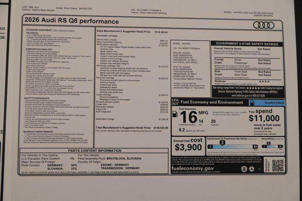 At Audi Henderson, our goal is to provide our customers with a Dealership experience that is unmatched in the Automotive Industry. Whether it's sales or service, parts or accessories, it is our goal to do our best for you on each and every visit. We believe Audi vehicles are some of the finest on the road today and our passion for what we do is obvious from the moment you set foot in our store. We've refined our processes, continually train our staff and take pride in what we do in effort to redefine the typical car-buying experience. Visit Audi Henderson today and experience the difference.2026 Audi RS Q8 performance 4.0T quattro quattroMythos Black Metallic 4.0L V8 Turbocharged DOHC 32V LEV3-ULEV125 631hp 4D Sport UtilityThis Audi RS Q8 performance is equipped with the following features:*Full Safety Inspection, *All Scheduled Service Up to Date.