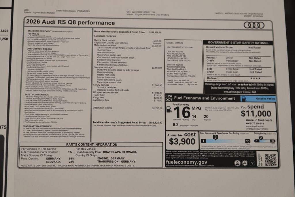 At Audi Henderson, our goal is to provide our customers with a Dealership experience that is unmatched in the Automotive Industry. Whether it's sales or service, parts or accessories, it is our goal to do our best for you on each and every visit. We believe Audi vehicles are some of the finest on the road today and our passion for what we do is obvious from the moment you set foot in our store. We've refined our processes, continually train our staff and take pride in what we do in effort to redefine the typical car-buying experience. Visit Audi Henderson today and experience the difference.2026 Audi RS Q8 performance 4.0T quattro quattroMythos Black Metallic 4.0L V8 Turbocharged DOHC 32V LEV3-ULEV125 631hp 4D Sport UtilityThis Audi RS Q8 performance is equipped with the following features:*Full Safety Inspection, *All Scheduled Service Up to Date.