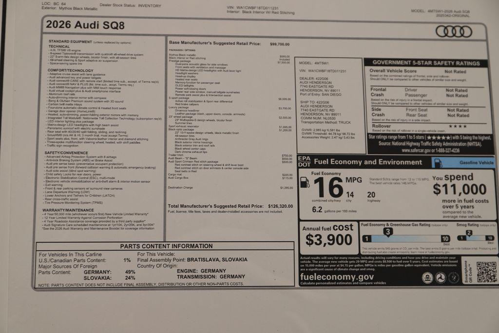 At Audi Henderson, our goal is to provide our customers with a Dealership experience that is unmatched in the Automotive Industry. Whether it's sales or service, parts or accessories, it is our goal to do our best for you on each and every visit. We believe Audi vehicles are some of the finest on the road today and our passion for what we do is obvious from the moment you set foot in our store. We've refined our processes, continually train our staff and take pride in what we do in effort to redefine the typical car-buying experience. Visit Audi Henderson today and experience the difference.2026 Audi SQ8 4.0T Prestige quattro quattroMythos Black Metallic 4.0L V8 Turbocharged DOHC 32V LEV3-ULEV125 500hp 4D Sport UtilityThis Audi SQ8 is equipped with the following features:*Full Safety Inspection, *All Scheduled Service Up to Date.