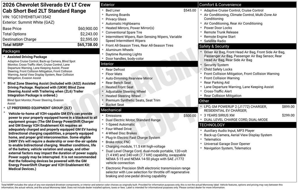 Welcome to Findlay Chevrolet GMC in Bullhead City, AZ. We have daily manager specials and deals going on. In many cases, our vehicles have additional incentives that are available based on things you might qualify for. Please contact our sales team for details. This Silverado EV is equipped with the following optional equipment: Preferred Equipment Group 2LT (Standard Range Battery Pack), 11.63 Axle Ratio, 3 Years SiriusXM, 4-Wheel Disc Brakes, 4-Wheel Independent Suspension, 6 Speakers, 6-Speaker Audio System Feature, 8-Way Power Driver Seat Adjuster, ABS brakes, Air Conditioning, Alloy wheels, AM/FM radio: SiriusXM with 360L, Auto High-beam Headlights, Auto-dimming Rear-View mirror, Automatic temperature control, Black Chevytec Spray-on Bedliner, Brake assist, Delay-off headlights, Driver 2-Way Power Lumbar Seat Adjuster, Driver door bin, Driver vanity mirror, Dual front impact airbags, Dual front side impact airbags, Electronic Stability Control, Emergency communication system: OnStar, Evotex Seat Trim, Four wheel independent suspension, Front anti-roll bar, Front Bucket Seats, Front Center Armrest w/Storage, Front dual zone A/C, Front Passenger 4-Way Manual Seat Adjuster, Front reading lights, Fully automatic headlights, Garage door transmitter, GM PowerUp 2 (J1772) Charger, Heated door mirrors, Heated Front Driver and Passenger Seats, Heated front seats, Heated steering wheel, Low tire pressure warning, Navigation System, Occupant sensing airbag, Outside temperature display, Overhead airbag, Overhead console, Panic alarm, Passenger door bin, Passenger vanity mirror, Power door mirrors, Power driver seat, Power steering, Power windows, Radio data system, Radio: 17.7"" Diagonal Advanced Color LCD Display, Rain sensing wipers, Rear reading lights, Rear step bumper, Rear window defroster, Remote keyless entry, Security system, SiriusXM with 360L Trial Subscription, Speed control, Speed-sensing steering, Split folding rear seat, Sport steering wheel, Steering wheel mounted audio controls, Telescoping steering wheel, Tilt steering wheel, Traction control, Trip computer, Variably intermittent wipers, and Wheels: 18"" x 8.5"" High Gloss Black Painted Aluminum.Summit White 2026 Chevrolet Silverado EV LT InTransit AWD 1-Speed Automatic Electric MotorMost Silverado EVs come equipped with Bluetooth, Backup Camera and many more standard safety features. Our sales team is available for additional details.Recent Arrival! 75/61 City/Highway MPG