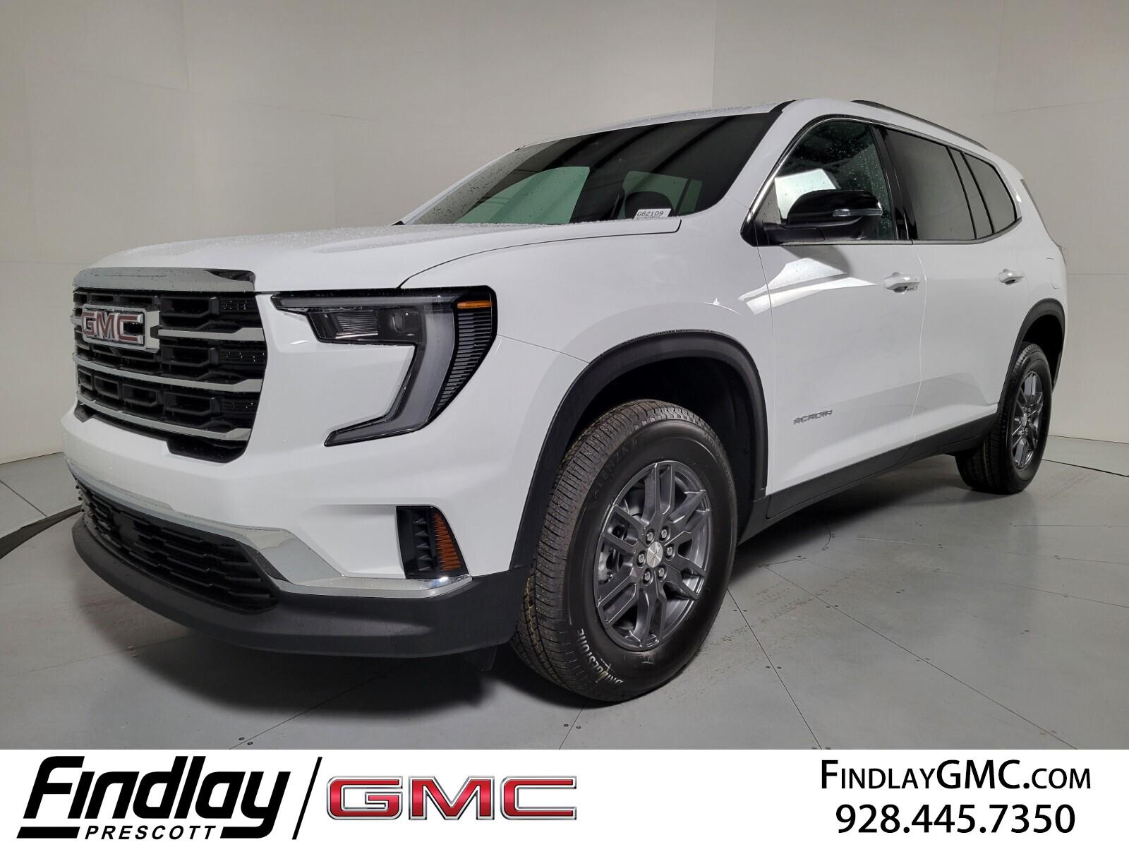 Welcome to Findlay GMC in Prescott, AZ. We have multiple locations with over 600 cars in stock. If you are looking for something specific that this Acadia doesn't have, please contact us directly. This GMC Acadia is equipped with the following options: Floor Liner Package (1st and 2nd Row All-Weather Floor Liner, 3rd Row All-Weather Floor Liner, and Integrated Cargo Liner), Preferred Equipment Group 4SC, FWD, After Dark Cloth, 12 Speakers, 18'' x 7.5'' Aluminum Wheels, 3.49 Final Drive Axle Ratio, 3rd row seats: split-bench, 4-Way Manual Front Passenger Seat Adjuster, 4-Wheel Disc Brakes, 8-Passenger Seating (2-3-3 Seating Configuration), 8-Way Power Driver Seat Adjuster, ABS brakes, Air Conditioning, Alloy wheels, AM/FM radio: SiriusXM with 360L, Apple CarPlay/Android Auto, Auto High-beam Headlights, Automatic temperature control, Bodyside moldings, Bose Premium 12-Speaker System with Sub-Woofer, Brake assist, Bumpers: body-color, Cloth Seat Trim, Compass, Delay-off headlights, Driver 2-Way Power Lumbar Seat Adjuster, Driver door bin, Driver vanity mirror, Dual front impact airbags, Dual front side impact airbags, Electronic Stability Control, Emergency communication system: OnStar Services capable, Exterior Parking Camera Rear, Four wheel independent suspension, Front anti-roll bar, Front Bucket Seats, Front Center Armrest, Front dual zone A/C, Front fog lights, Front reading lights, Fully automatic headlights, Heated door mirrors, Heated Driver and Front Passenger Seats, Heated front seats, Heated steering wheel, Illuminated entry, Leather steering wheel, Low tire pressure warning, Navigation System, Occupant sensing airbag, Outside temperature display, Overhead airbag, Overhead console, Panic alarm, Passenger door bin, Passenger vanity mirror, Power door mirrors, Power driver seat, Power Liftgate, Power steering, Power windows, Radio data system, Radio: 15'' Diagonal Premium GMC Infotainment System, Rear air conditioning, Rear anti-roll bar, Rear reading lights,