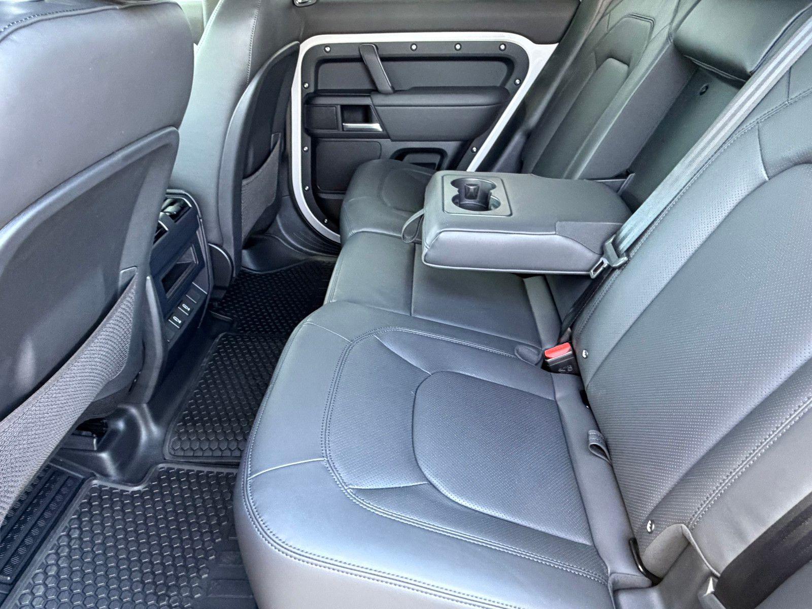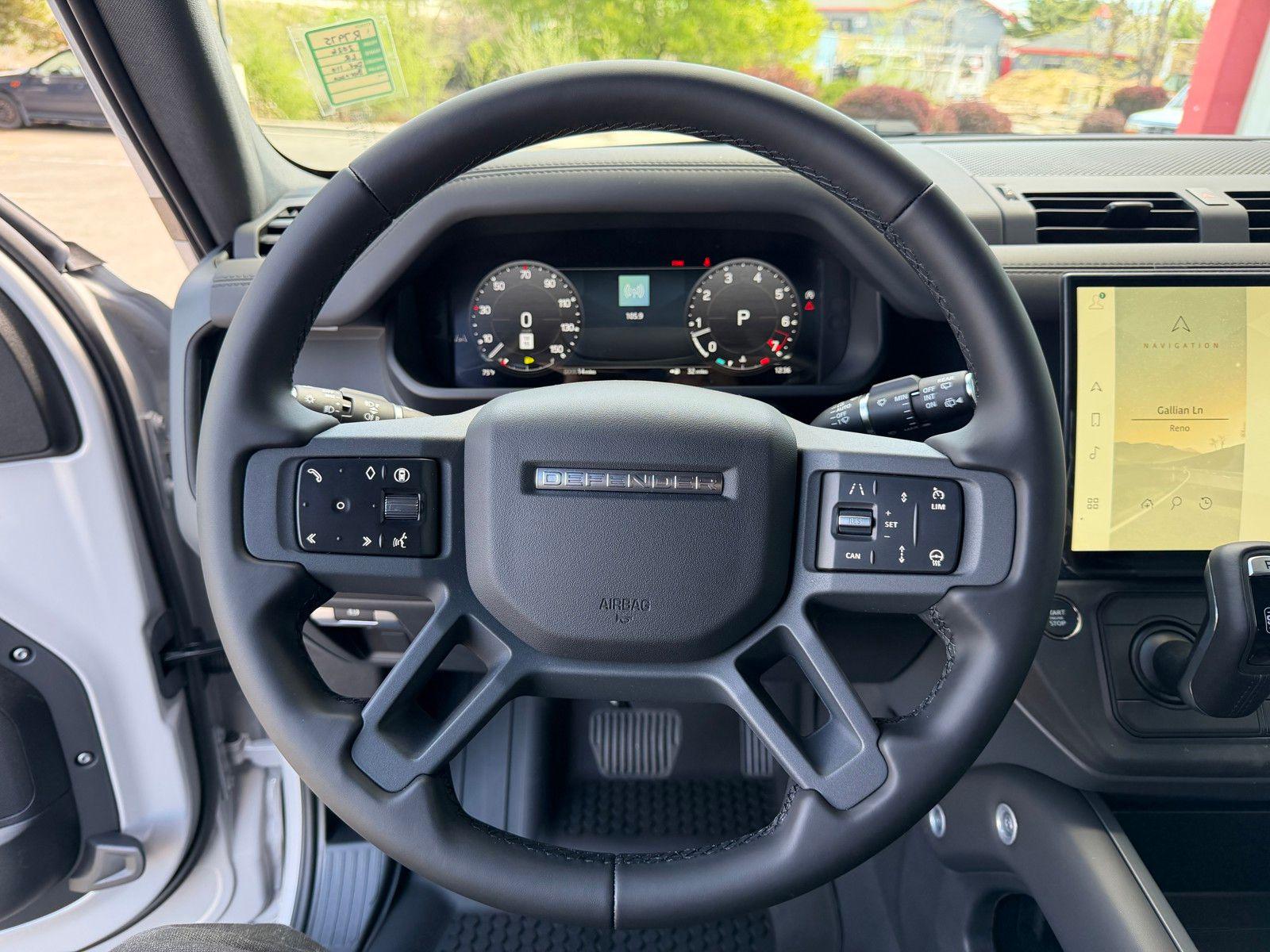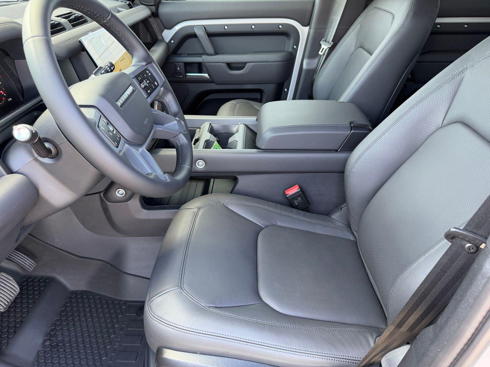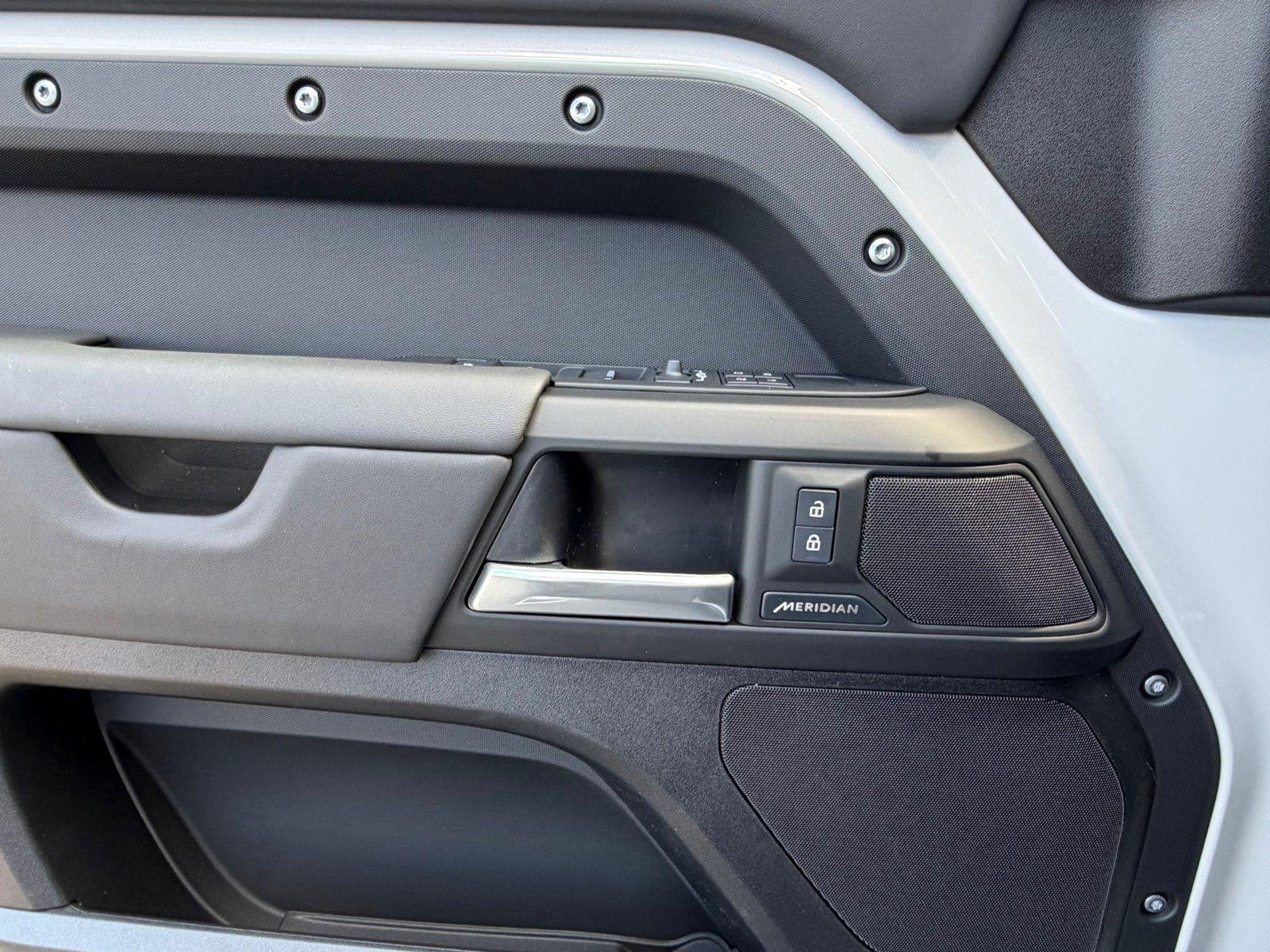 This Land Rover Defender 110 is equipped with the following options and extra equipment: 11 Speakers, 12-Way Heated Electric Memory Front Seats, 4-Wheel Disc Brakes, ABS brakes, Air Conditioning, Alloy wheels, AM/FM radio: SiriusXM, Apple CarPlay & Android Auto, Auto High-beam Headlights, Auto tilt-away steering wheel, Auto-dimming door mirrors, Auto-dimming Rear-View mirror, Automatic temperature control, Brake assist, Bumpers: body-color, Compass, Delay-off headlights, Driver door bin, Driver vanity mirror, Dual front impact airbags, Dual front side impact airbags, Electronic Stability Control, Exterior Parking Camera Rear, Four wheel independent suspension, Front anti-roll bar, Front Bucket Seats, Front Center Armrest, Front dual zone A/C, Front fog lights, Front reading lights, Fully automatic headlights, Garage door transmitter: HomeLink, Heated door mirrors, Heated front seats, Heated steering wheel, Illuminated entry, Low tire pressure warning, Memory seat, Navigation system: Connected Navigation PIVI Pro, Occupant sensing airbag, Outside temperature display, Overhead airbag, Overhead console, Panic alarm, Passenger door bin, Passenger vanity mirror, Power door mirrors, Power driver seat, Power moonroof, Power passenger seat, Power steering, Power windows, Radio data system, Radio: Meridian Sound System, Rain sensing wipers, Rear anti-roll bar, Rear fog lights, Rear reading lights, Rear seat center armrest, Rear window defroster, Rear window wiper, Remote keyless entry, Resist and Resolve Seat Trim, Security system, Speed control, Speed-sensing steering, Speed-Sensitive Wipers, Split folding rear seat, Steering wheel memory, Steering wheel mounted audio controls, Tachometer, Telescoping steering wheel, Tilt steering wheel, Traction control, Trip computer, Variably intermittent wipers, Weather band radio, and Wheels: 19"" Gloss Sparkle Silver Style 6010.AWD 8-Speed Automatic 2.0L I4 DI Turbocharged