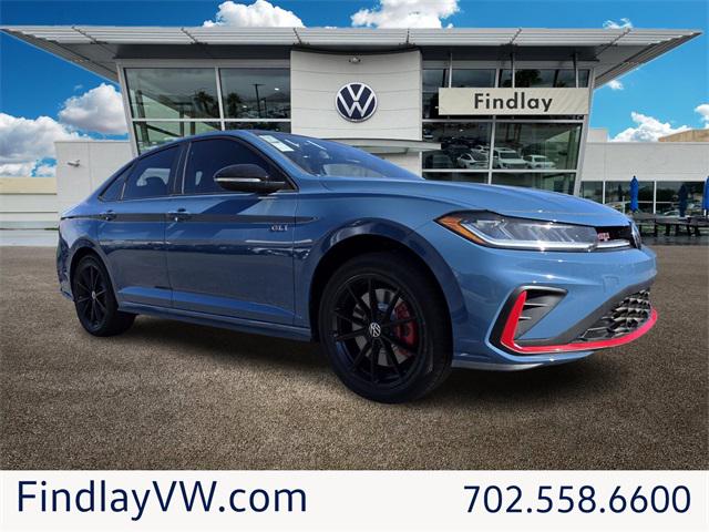 Blue 2026 Volkswagen Jetta GLI 2.0T Autobahn FWD 7-Speed DSG Automatic with Tiptronic 2.0L TSI DOHC 4-Wheel Disc Brakes, 8 Speakers, ABS brakes, Active Blind Spot Monitor, Air Conditioning, AM/FM radio: SiriusXM with 360L, Auto High-beam Headlights, Auto-dimming Rear-View mirror, Automatic temperature control, Brake assist, Bumpers: body-color, Custom 20"" Black Wheels, Deep Black Pearl Roof, Deep Black Pearl Side Mirror Caps, Delay-off headlights, Driver door bin, Driver vanity mirror, Dual front impact airbags, Dual front side impact airbags, Electronic Stability Control, Emergency communication system: VW Car-Net Safe & Secure 5-year, Exterior Parking Camera Rear, Four wheel independent suspension, Front anti-roll bar, Front Bucket Seats, Front Center Armrest, Front dual zone A/C, Front reading lights, Fully automatic headlights, GLI Black Package, Heated and Actively Ventilated Front Seats, Heated door mirrors, Heated front seats, Heated steering wheel, Heavy Duty Trunk Liner with VW CarGo Blocks, Illuminated entry, Leather Shift Knob, Leather steering wheel, Low tire pressure warning, Memory seat, Occupant sensing airbag, Outside temperature display, Overhead airbag, Overhead console, Panic alarm, Passenger door bin, Passenger vanity mirror, Perforated Vienna Leather Seating Surfaces, Power door mirrors, Power driver seat, Power moonroof, Power steering, Power windows, Radio data system, Radio: MIB3 Composition Media with Touchscreen, Rain sensing wipers, Rear anti-roll bar, Rear reading lights, Rear seat center armrest, Rear window defroster, Remote keyless entry, Rubber Monster Mats (set of 4), Security system, Speed control, Speed-sensing steering, Split folding rear seat, Sport steering wheel, Steering wheel mounted audio controls, Tachometer, Telescoping steering wheel, Tilt steering wheel, Traction control, Trip computer, Turn signal indicator mirrors, Variably intermittent wipers, Ventilated front seats, VW Care, Wheels: 18"" Black Painted Alloy, Wheels: 18"" Two-Tone Machined Alloy.25/35 City/Highway MPG